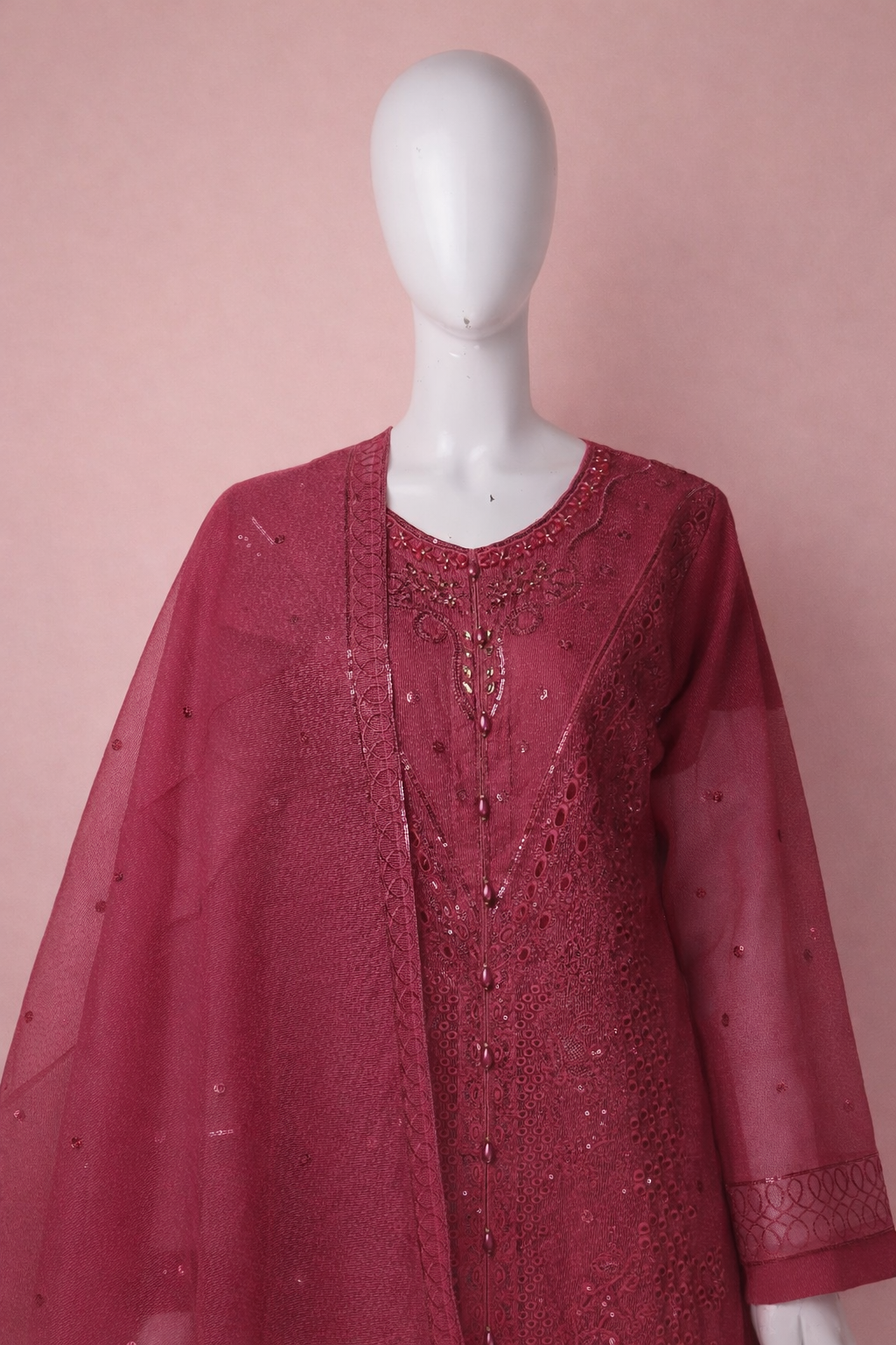 Make a graceful statement with this luxurious 3 piece embroidered cotton net suit in a beautiful pink shade. Crafted from premium cotton net fabric, this elegant outfit offers a soft, breathable, and lightweight feel for comfortable wear. The shirt is beautifully detailed with intricate embroidery, sequins, and delicate embellishments that add a refined festive touch. Paired with a matching cotton net dupatta and coordinated trousers, this suit is perfect for weddings, festive events, dinners, and semi-formal occasions.
