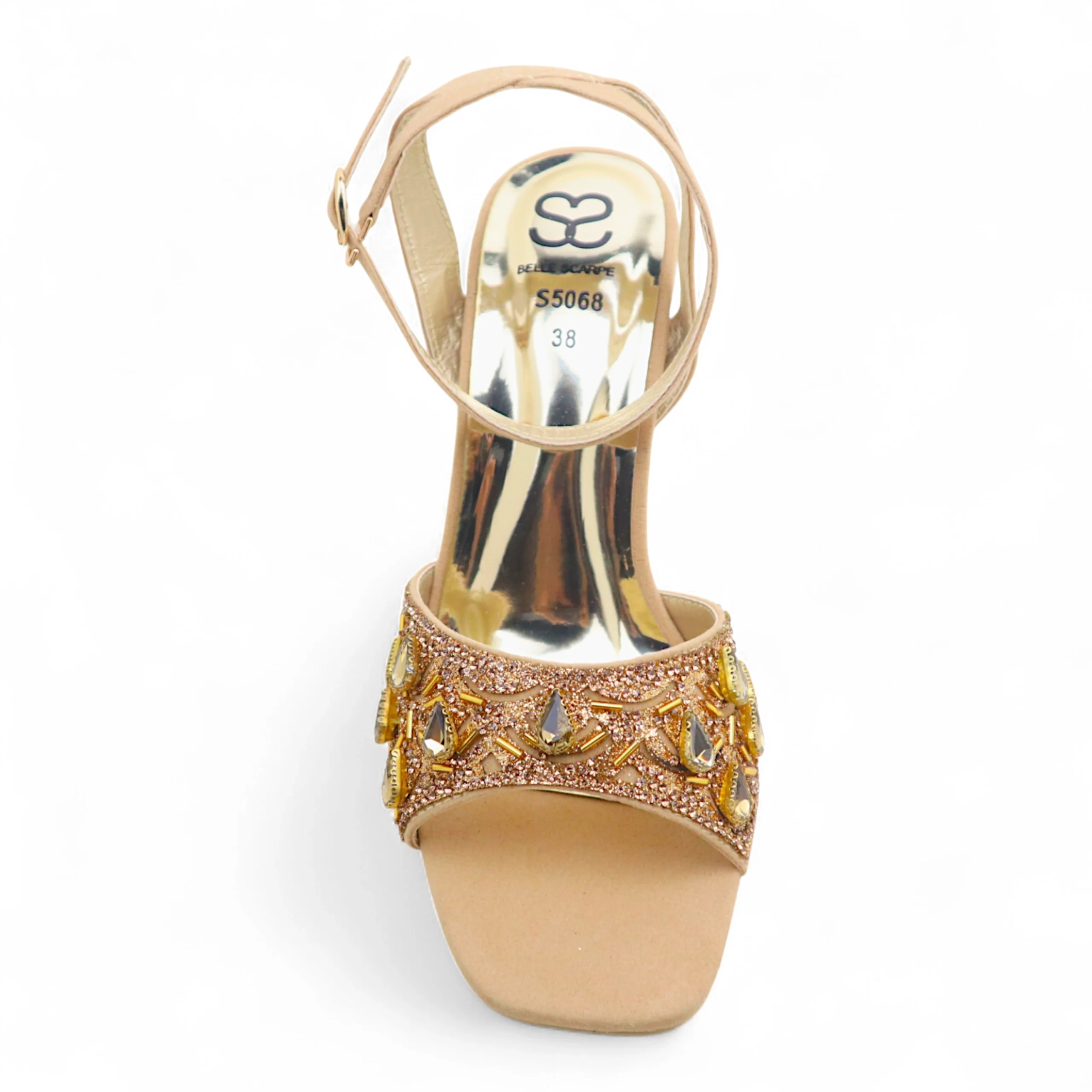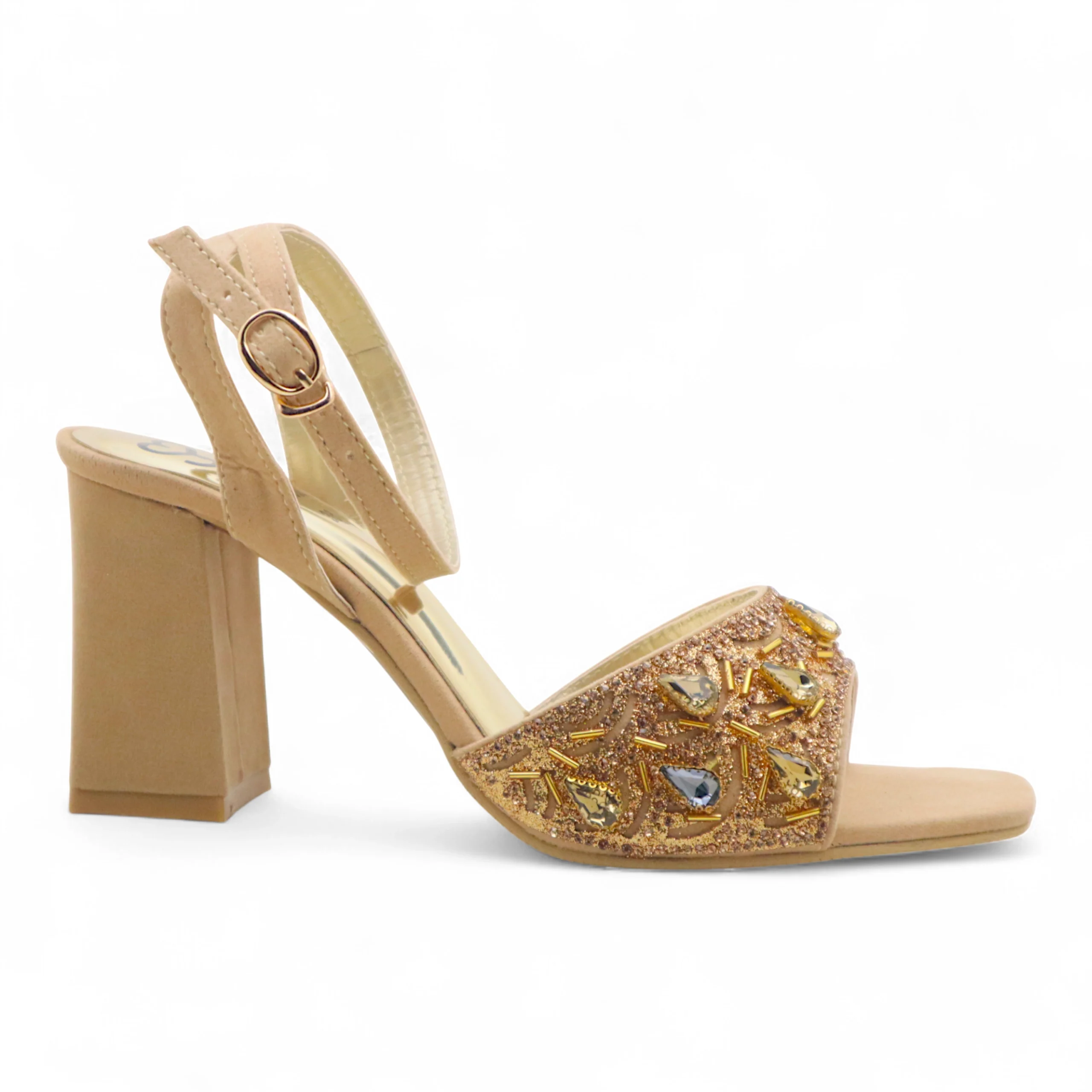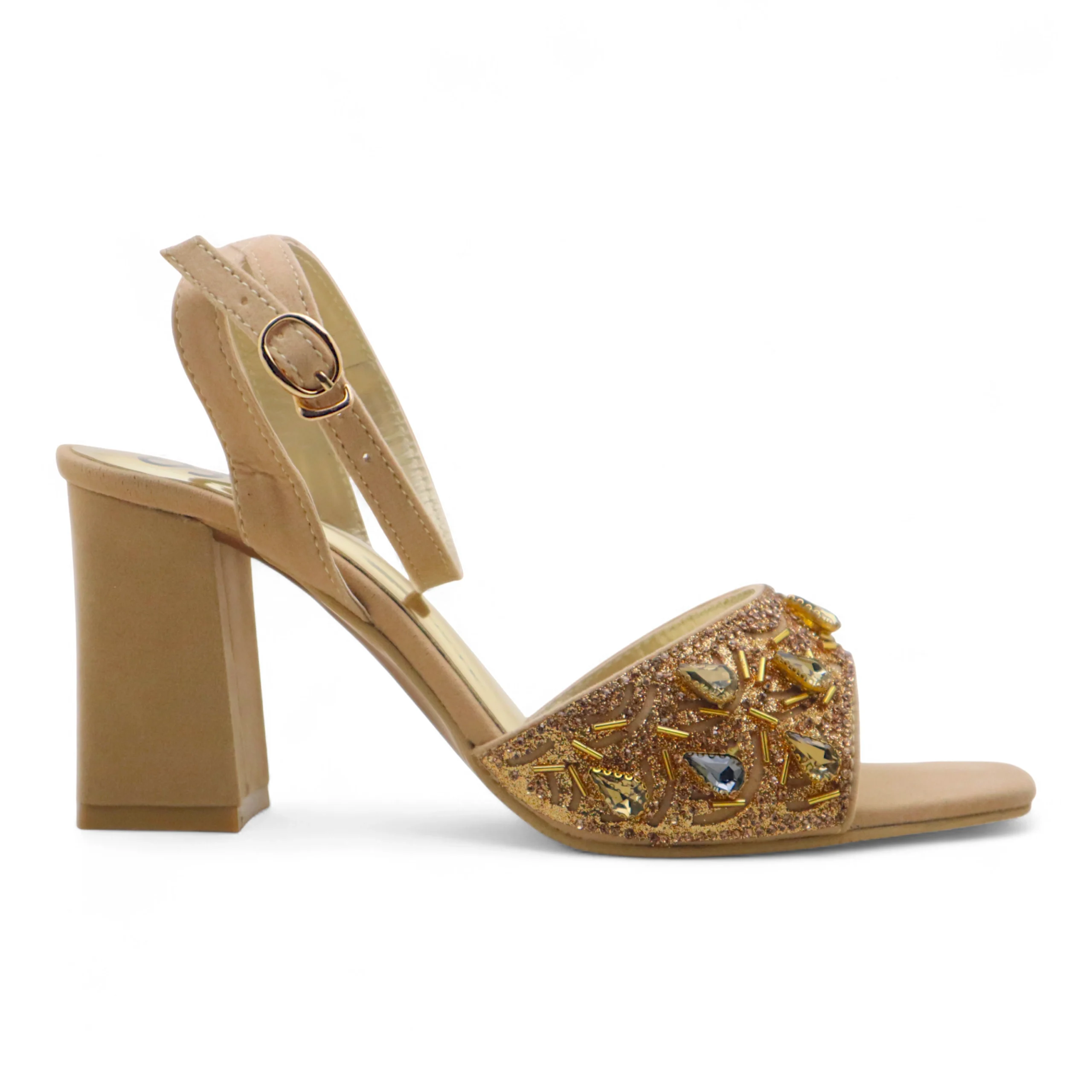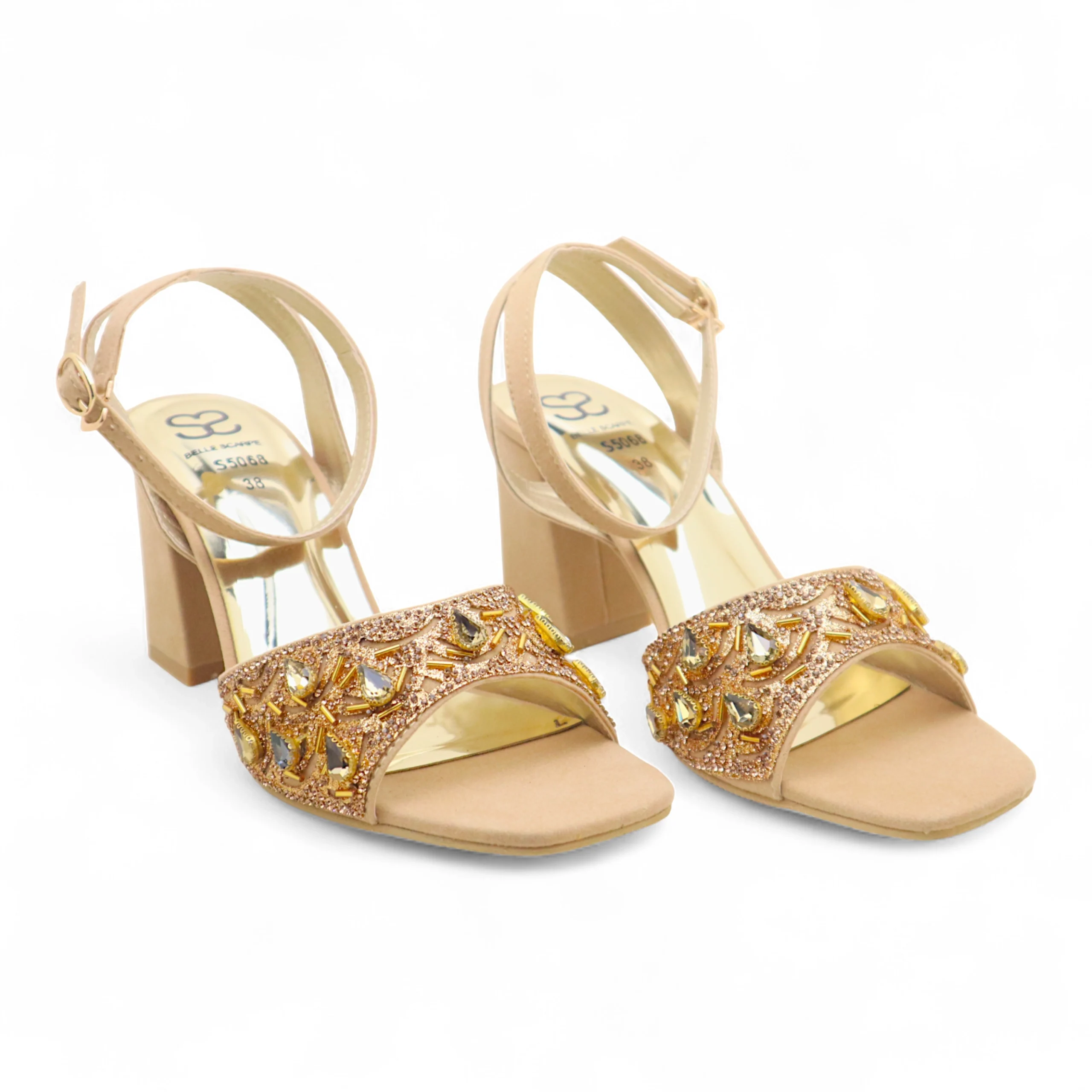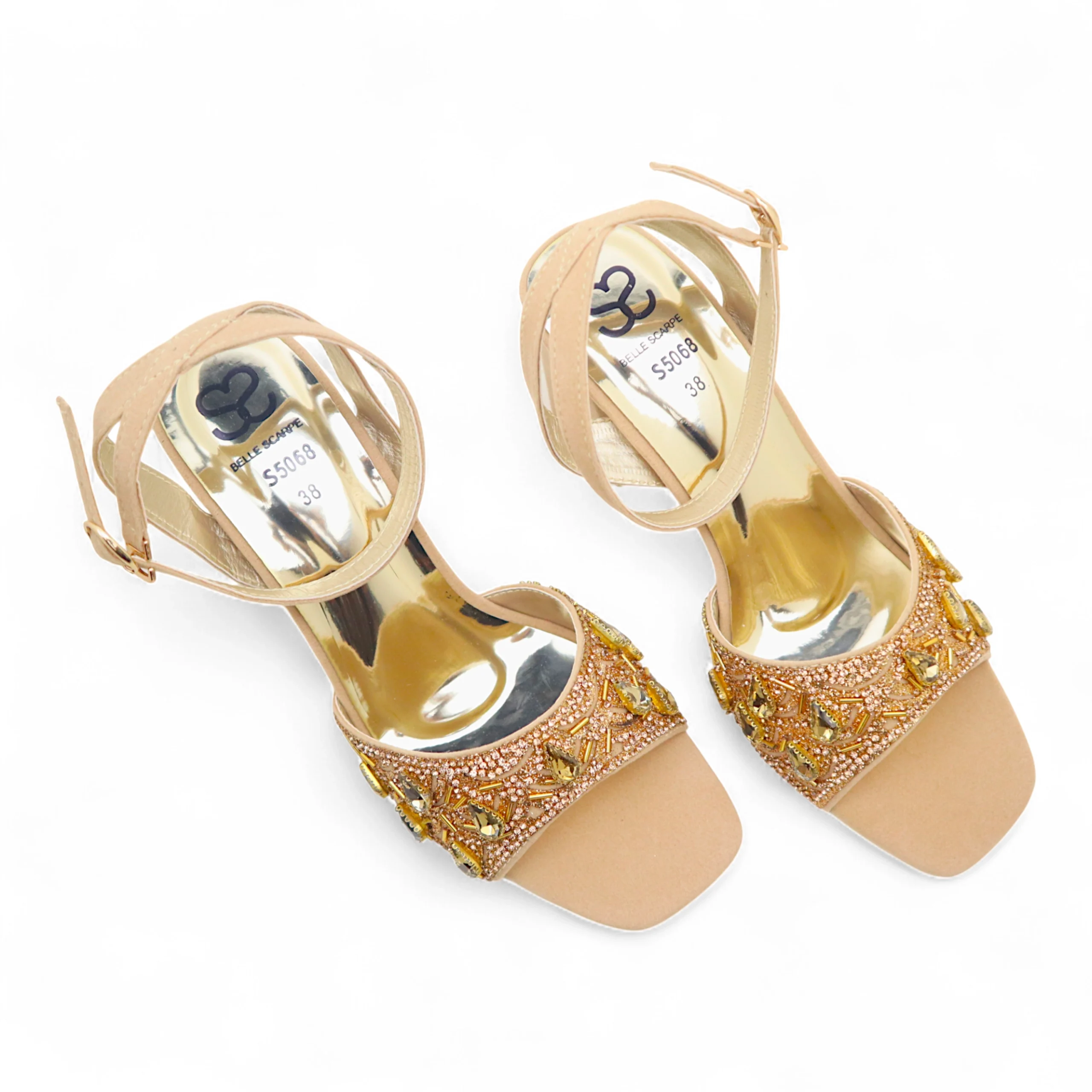Add a touch of luxury to your look with these elegant golden block heel sandals. Designed with a beautifully embellished front strap featuring intricate beadwork and crystal accents, these heels are perfect for making a statement at any special occasion.