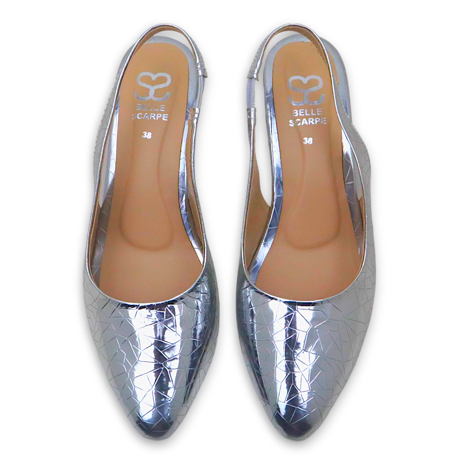 Introducing the Argent Textura, a sophisticated 2-inch slingback heel that embodies sleek minimalism with a shimmering silver finish. Designed in luminous silver with a subtle textured effect, this heel exudes elegance through its pointed-toe silhouette and effortless slingback design.
