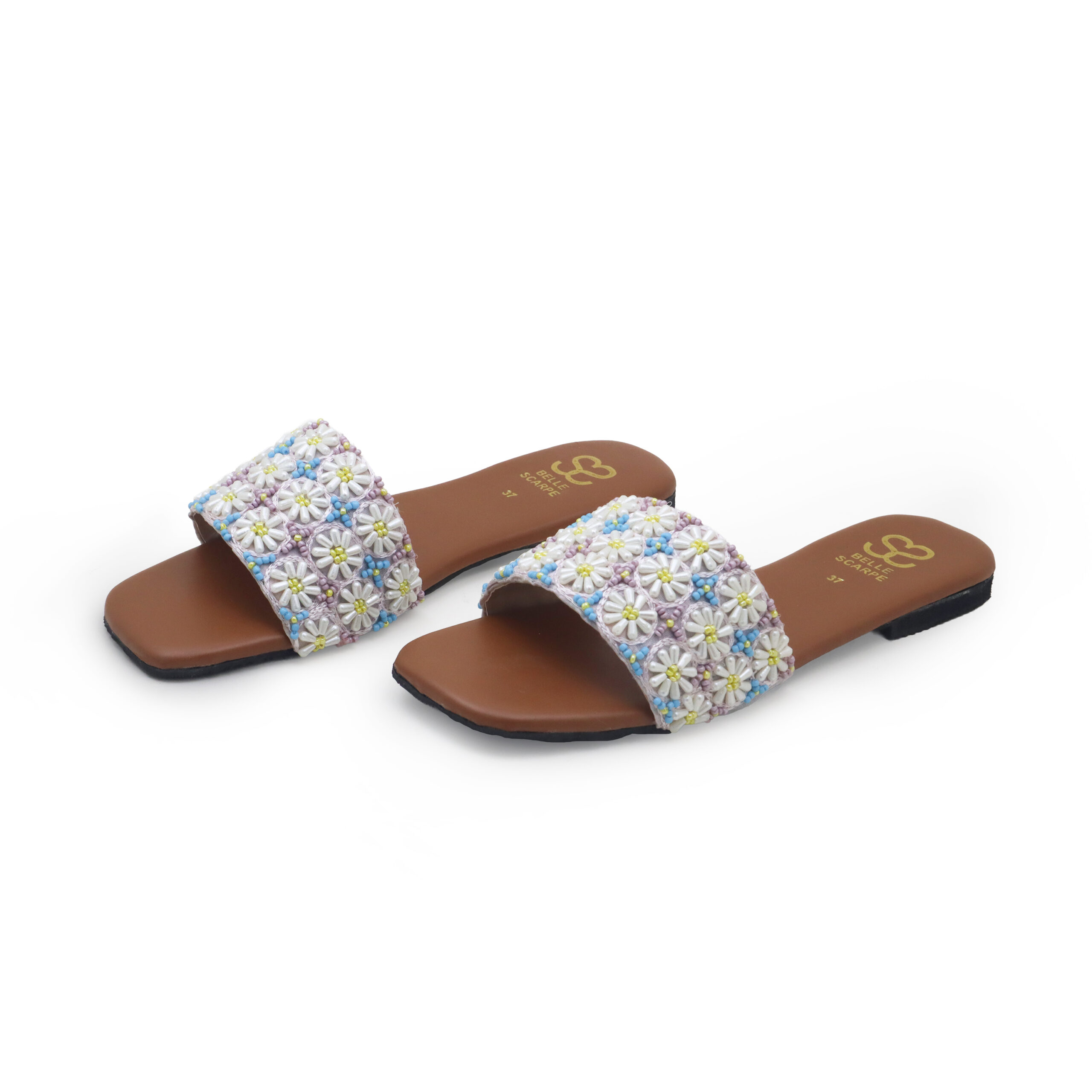 The elegant design features intricate white floral beadwork with subtle blue bead accents, adding a refreshing and graceful pop of color. Comfortable, refined, and full of charm, the Blossom Charm is the perfect piece to elevate any look, from festive celebrations to daily outings.