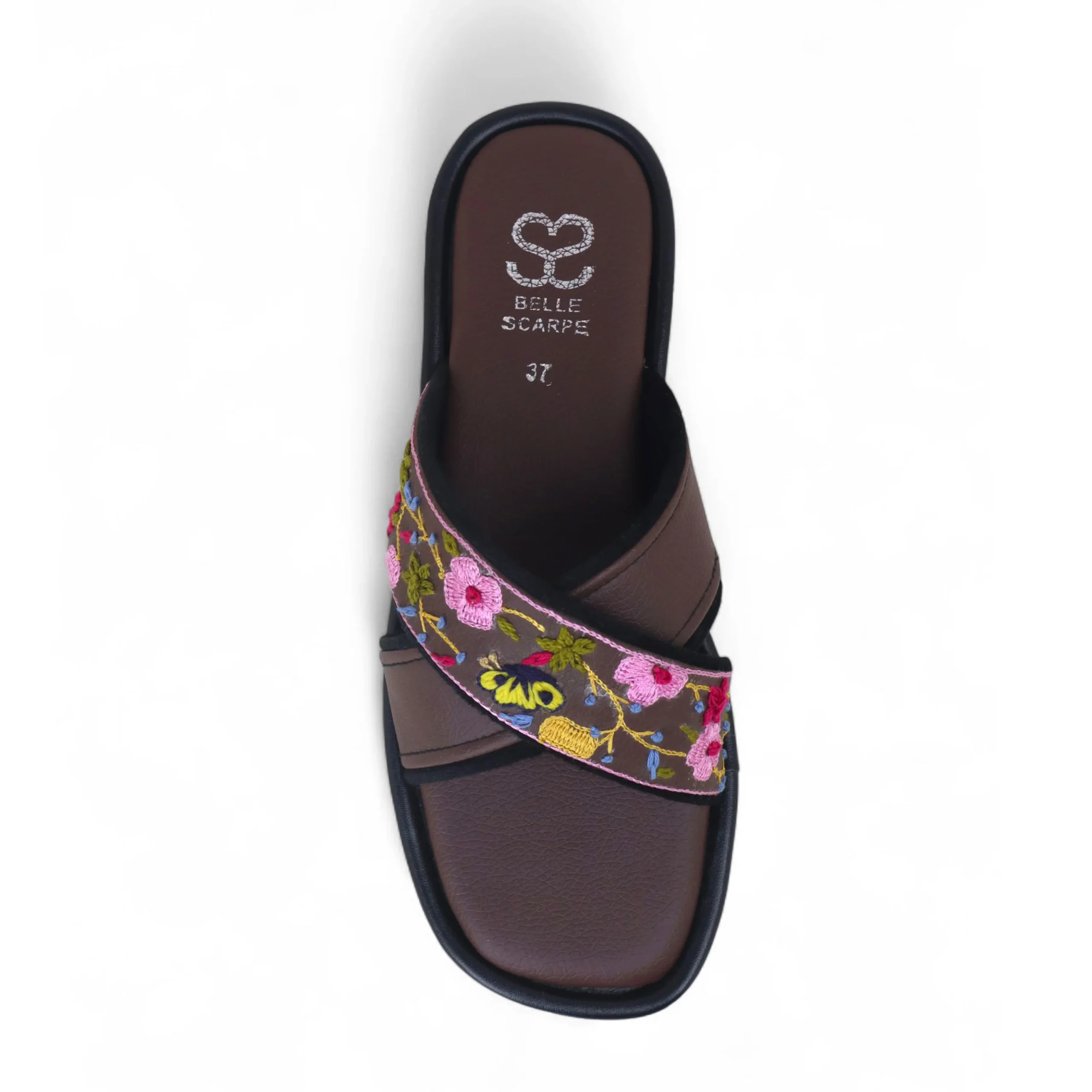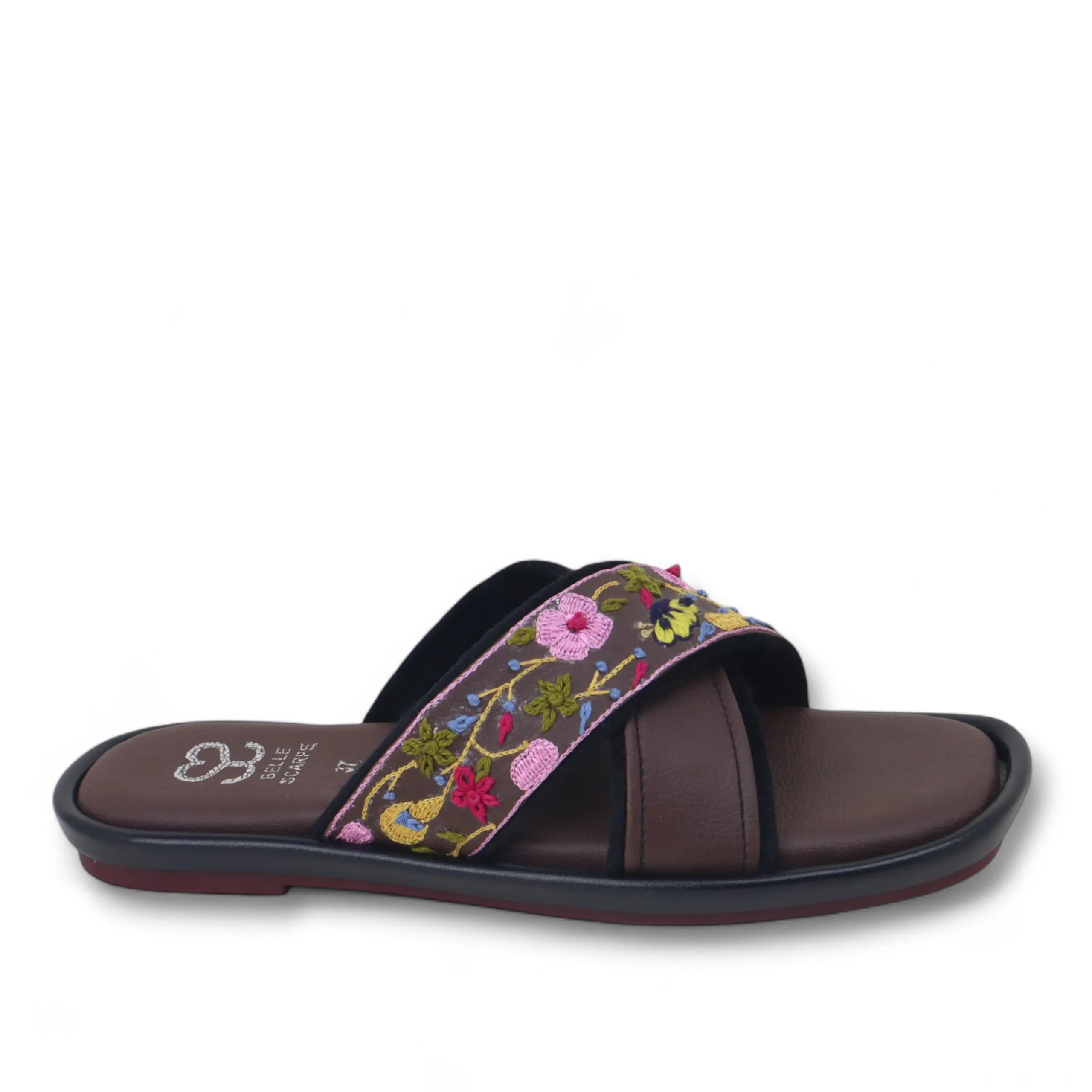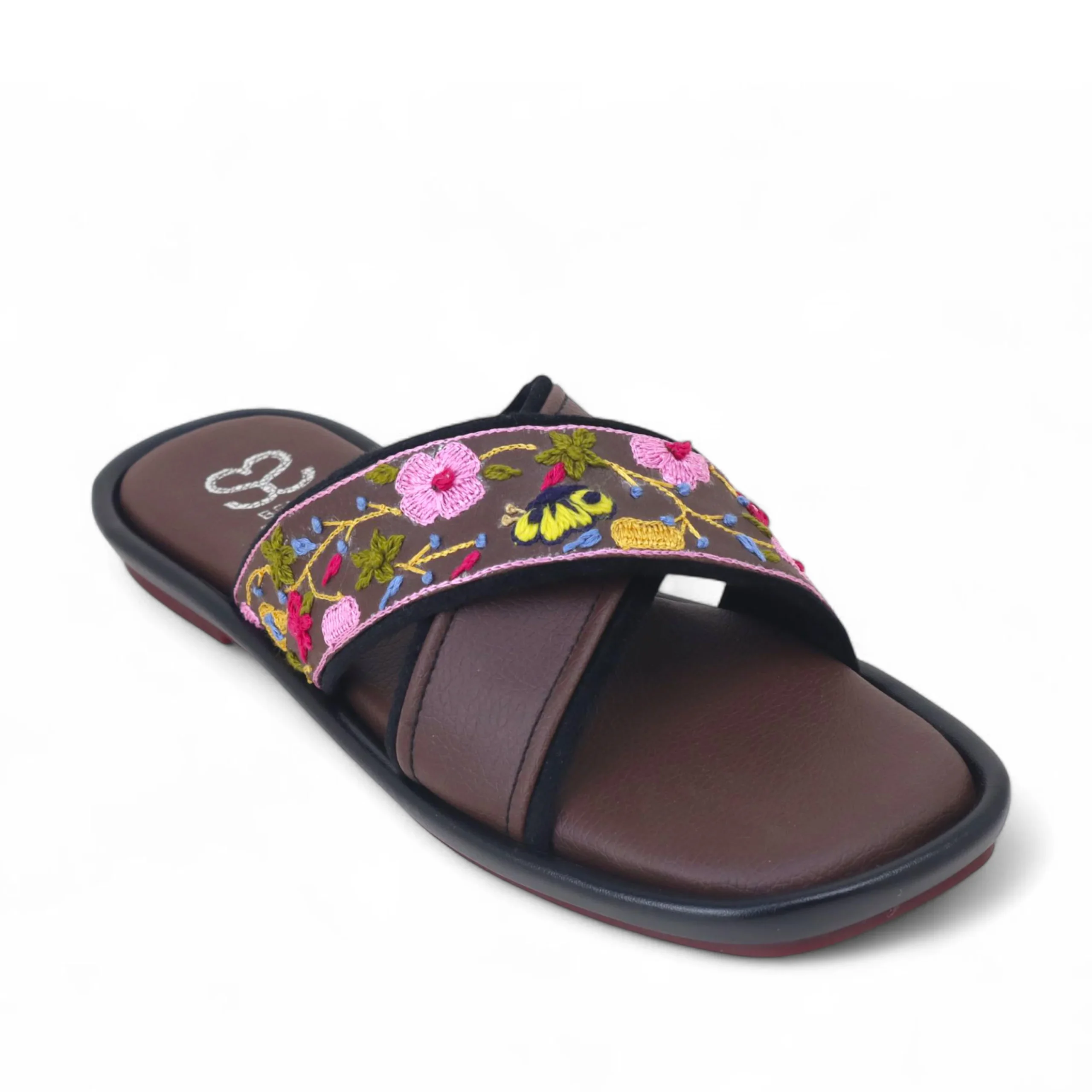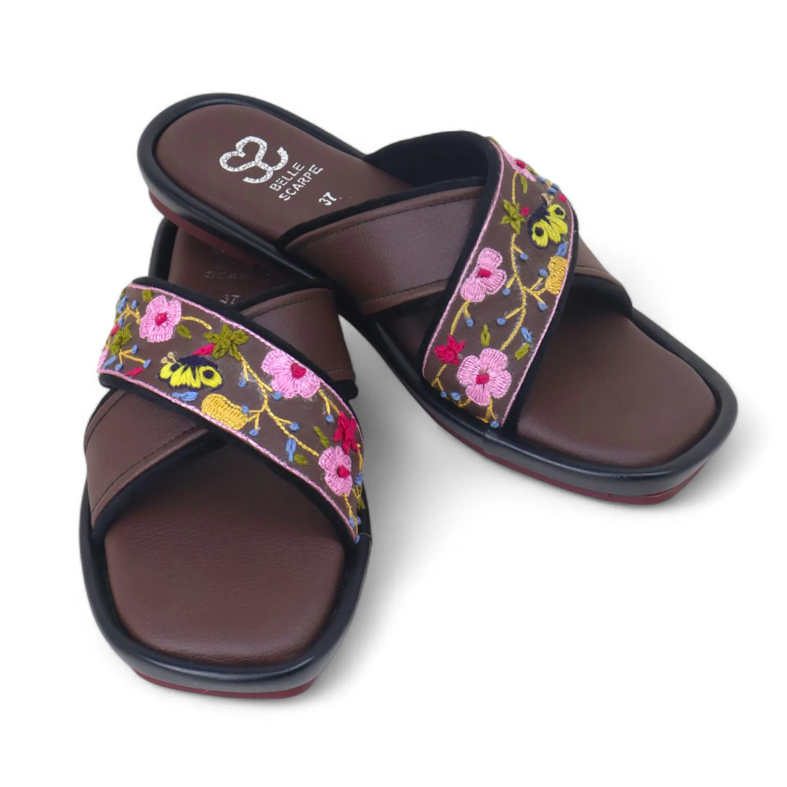 Introducing the Chocolate Forest, a sumptuous flat shoe that embodies the essence of whimsical elegance. This captivating design features a crisscross pattern, expertly woven to create a sense of intricate texture and visual interest.