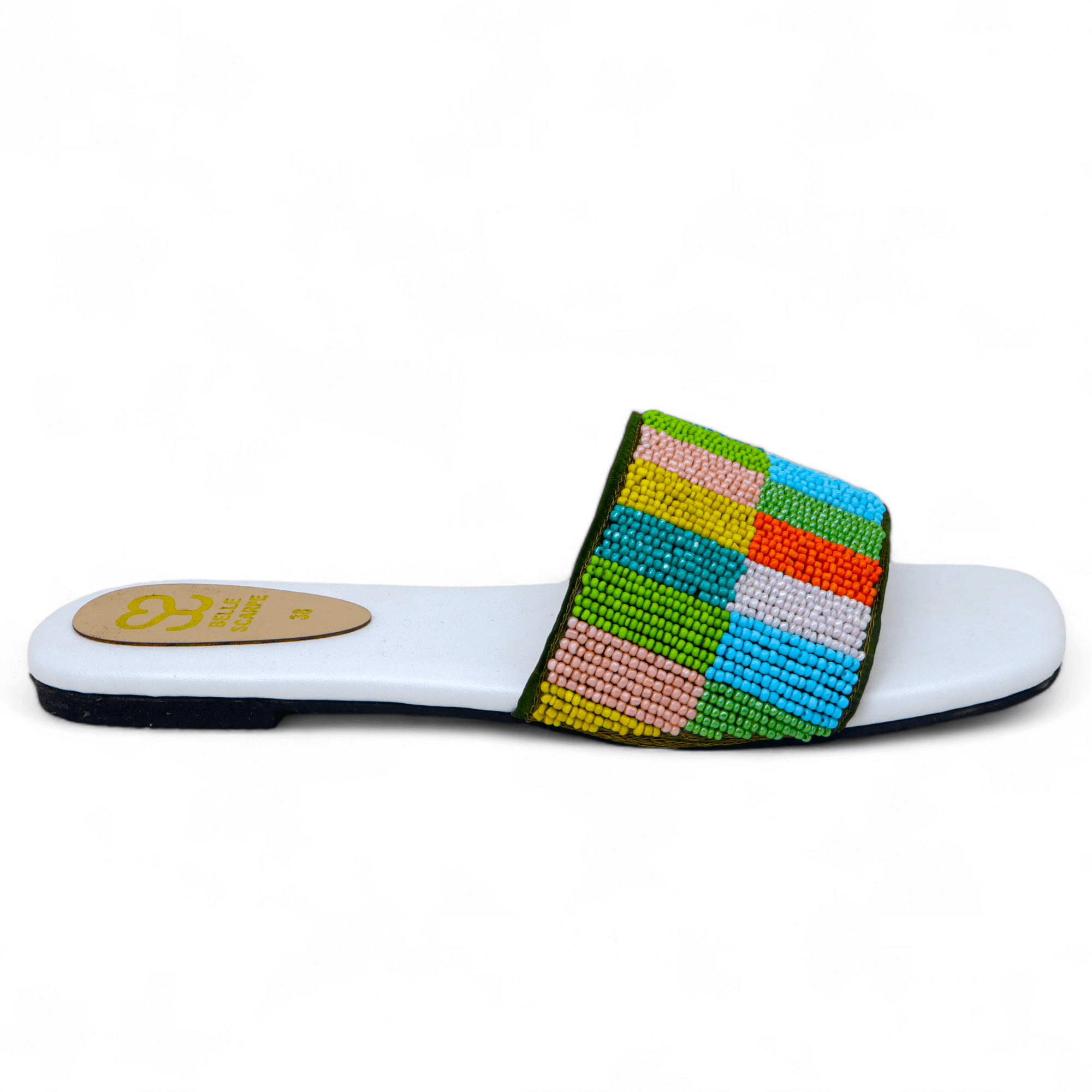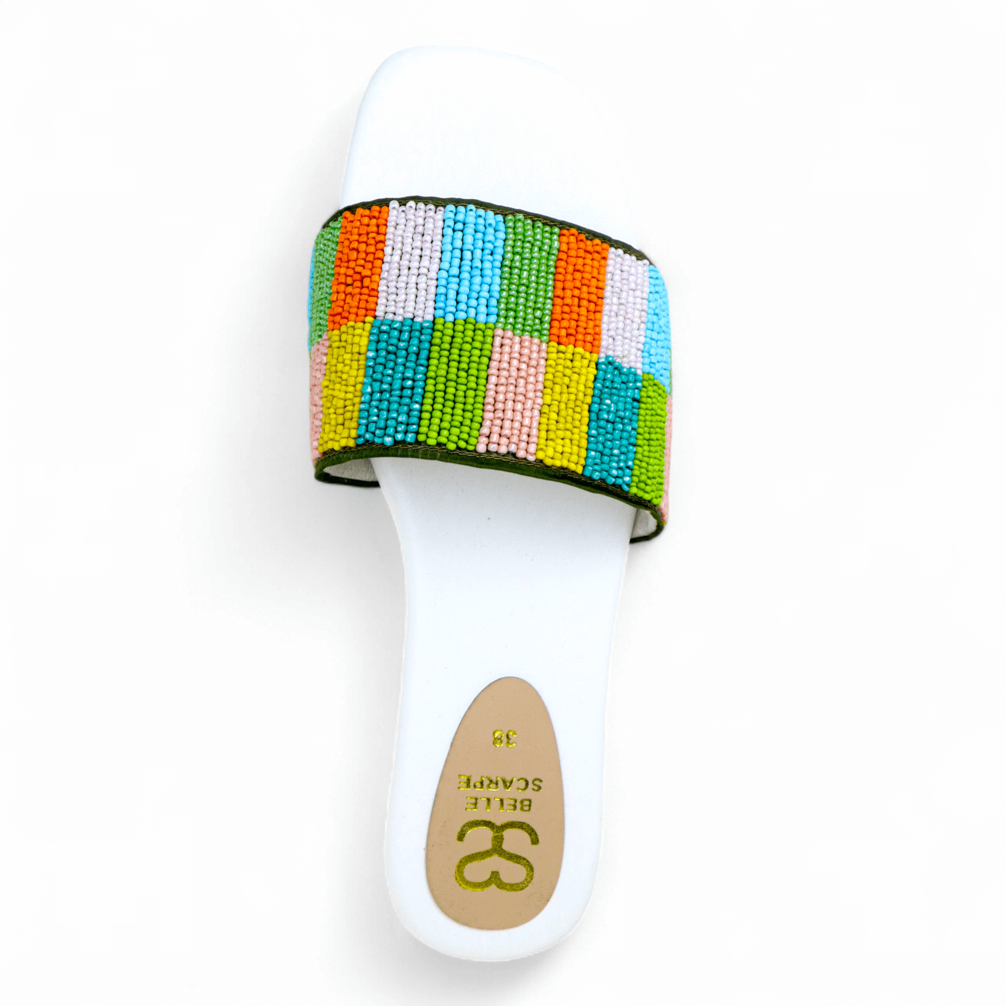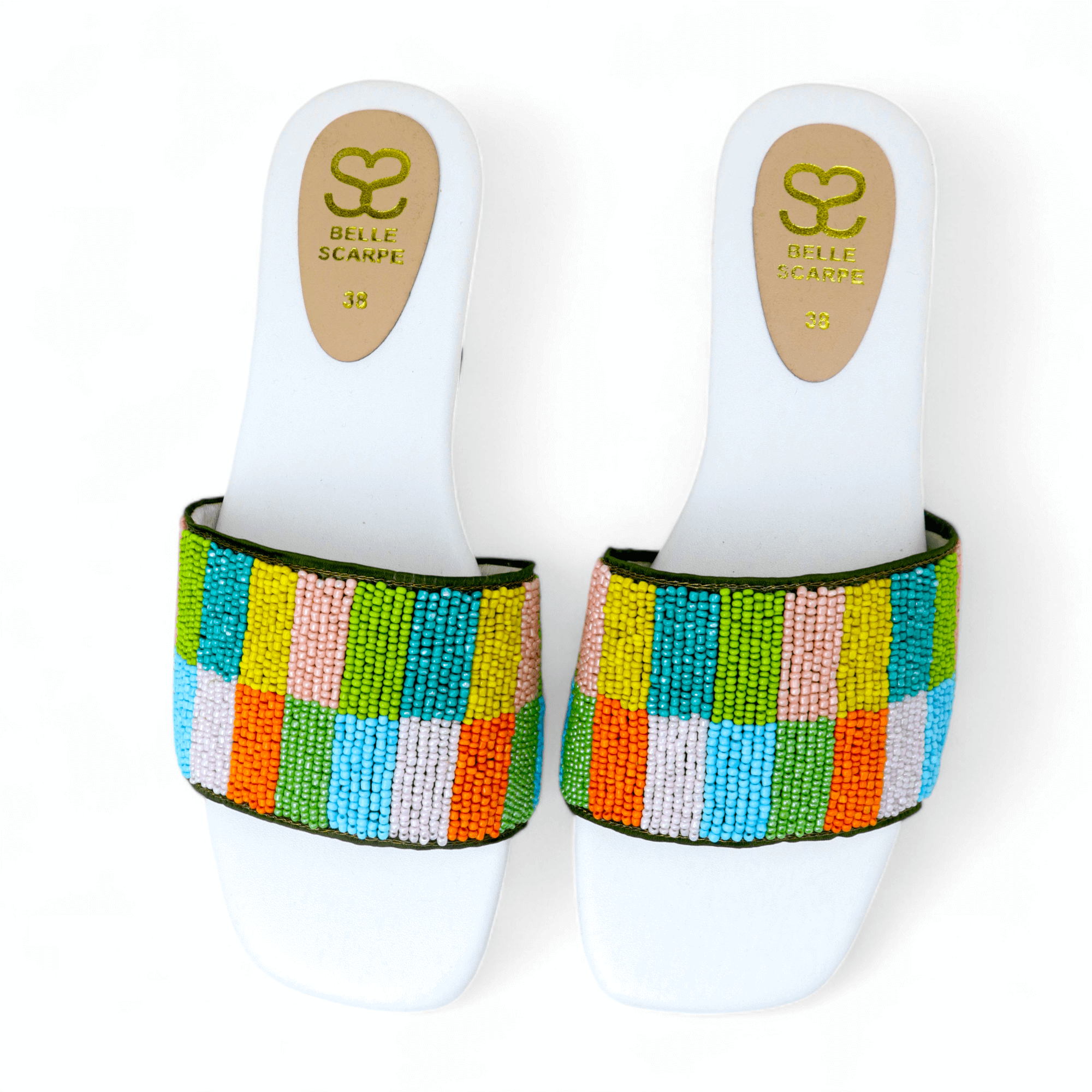 Welcome to Belle Scarpe, where artisanal craftsmanship converges with vibrant style to create truly exceptional footwear. Introducing our 'Color Block' sliders, a masterpiece of handcrafted elegance that showcases intricate beadwork in a kaleidoscope of colors - sunny yellow, soft light pink, celestial sky blue, pristine white, and many more - carefully arranged in a mosaic block pattern, evoking a sense of polychromatic sophistication.