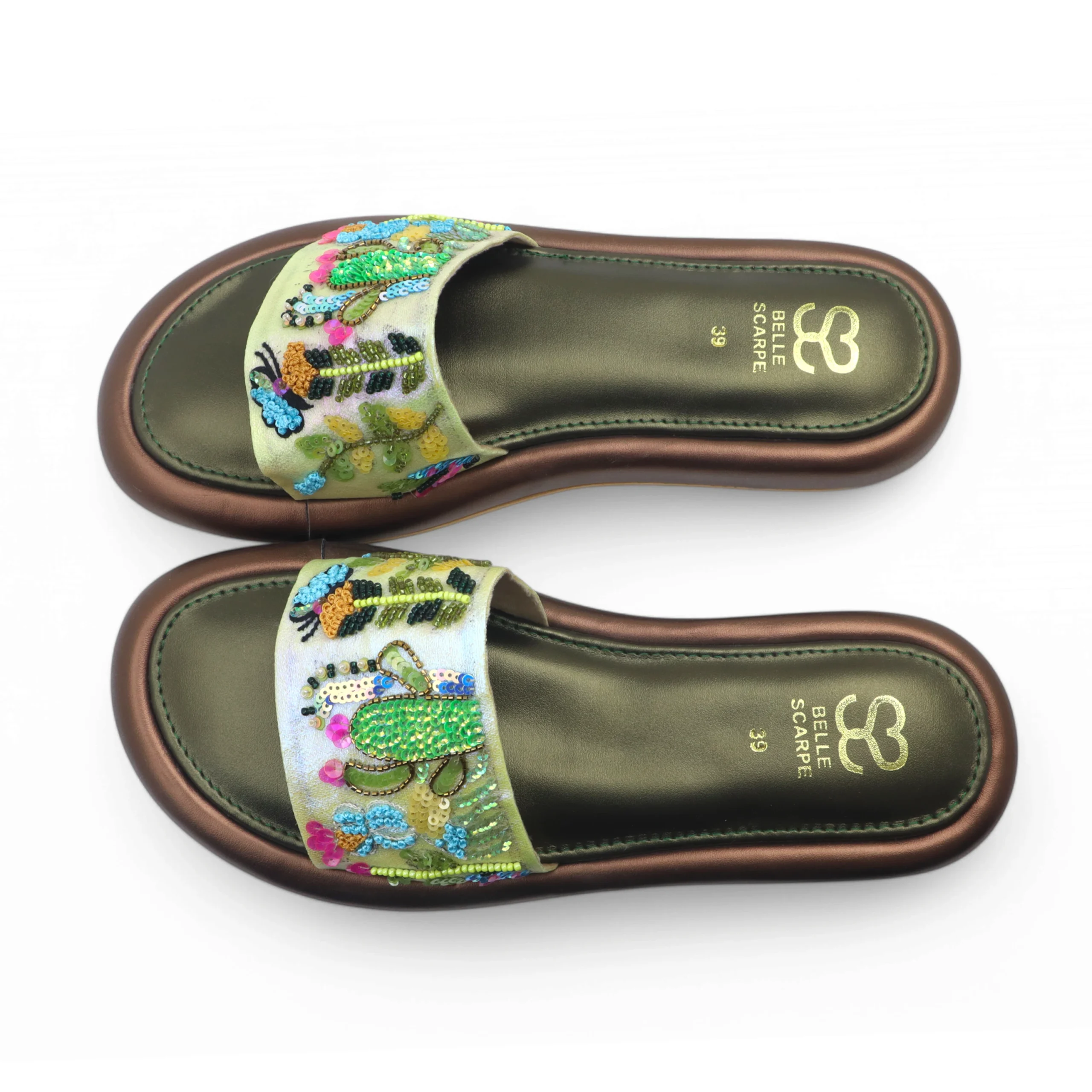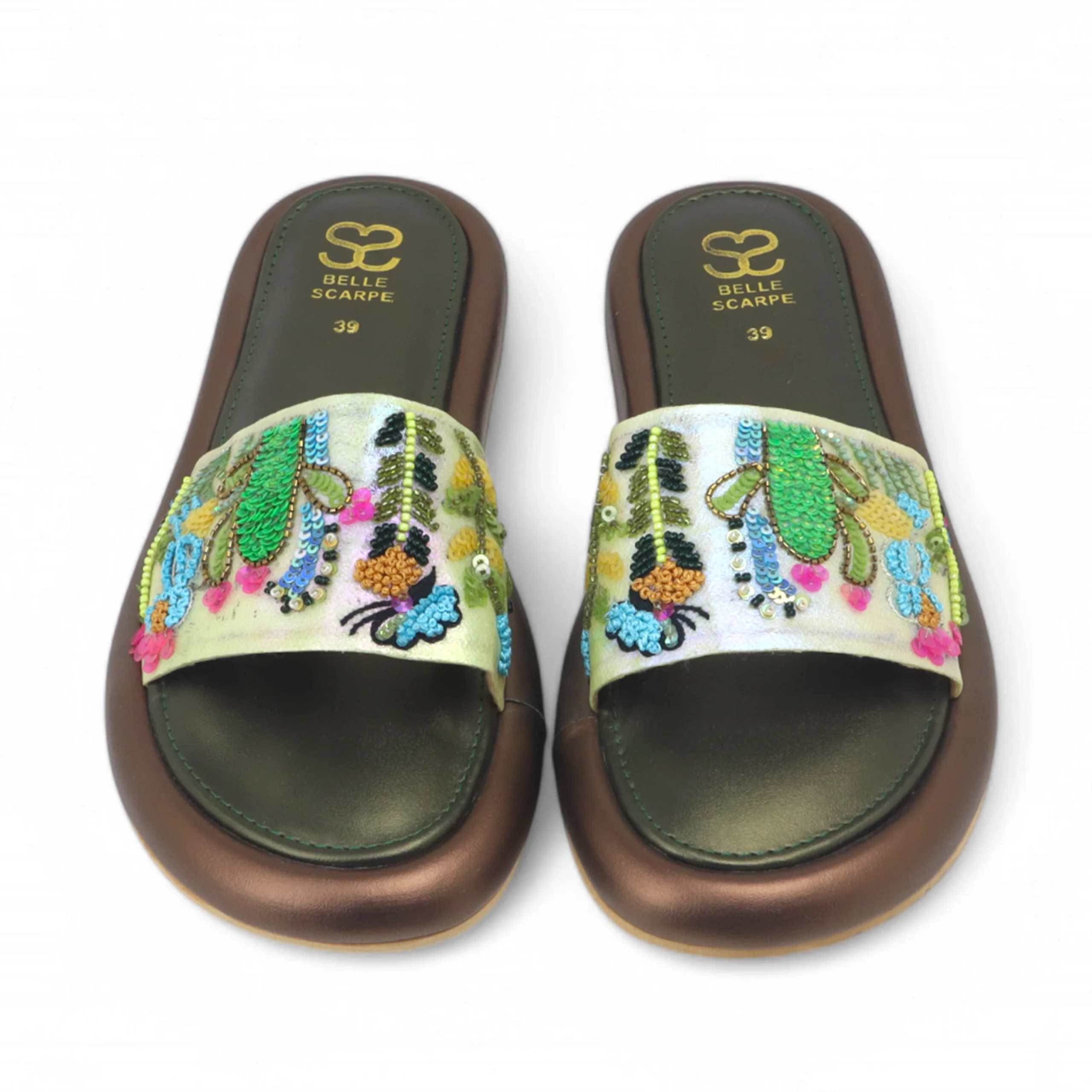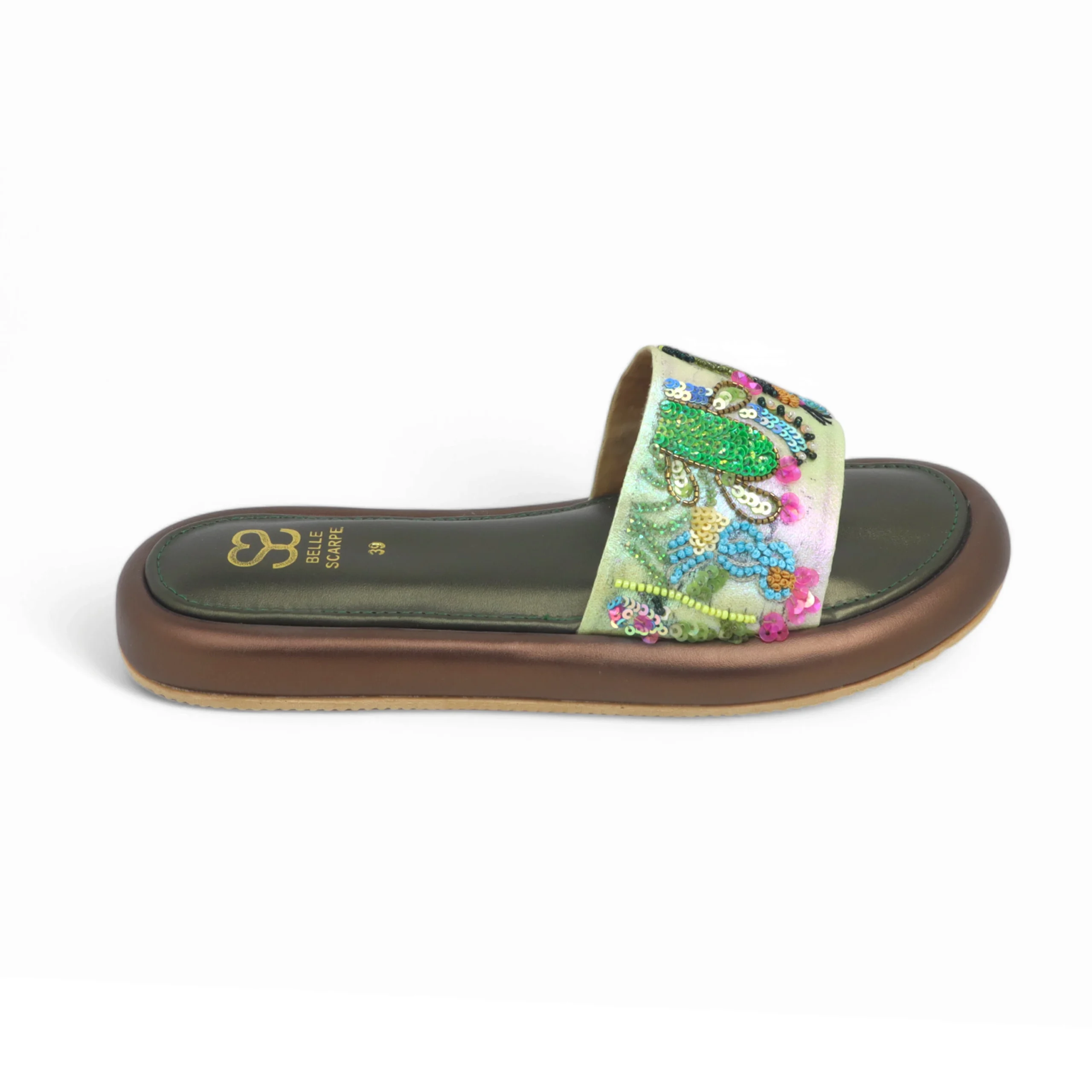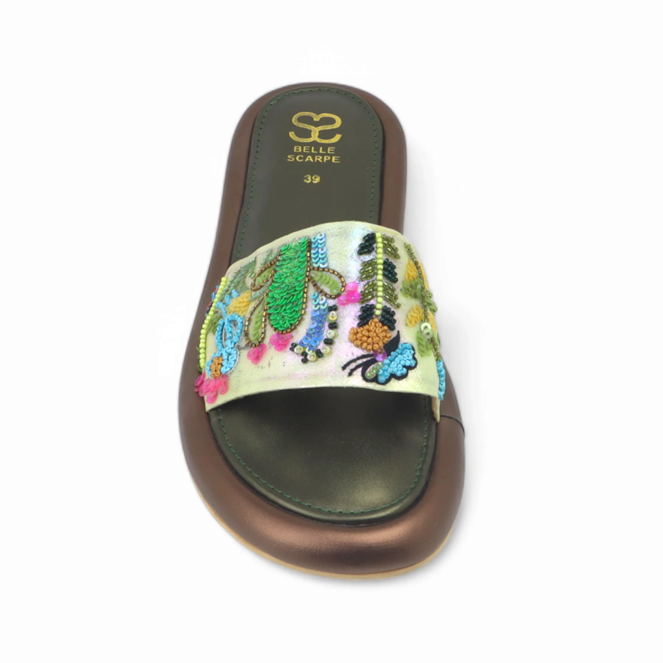 Upper: Premium shimmery leather – Hand-embroidered thread work with intricate floral patterns – Delicate, precision-placed sequins and beads