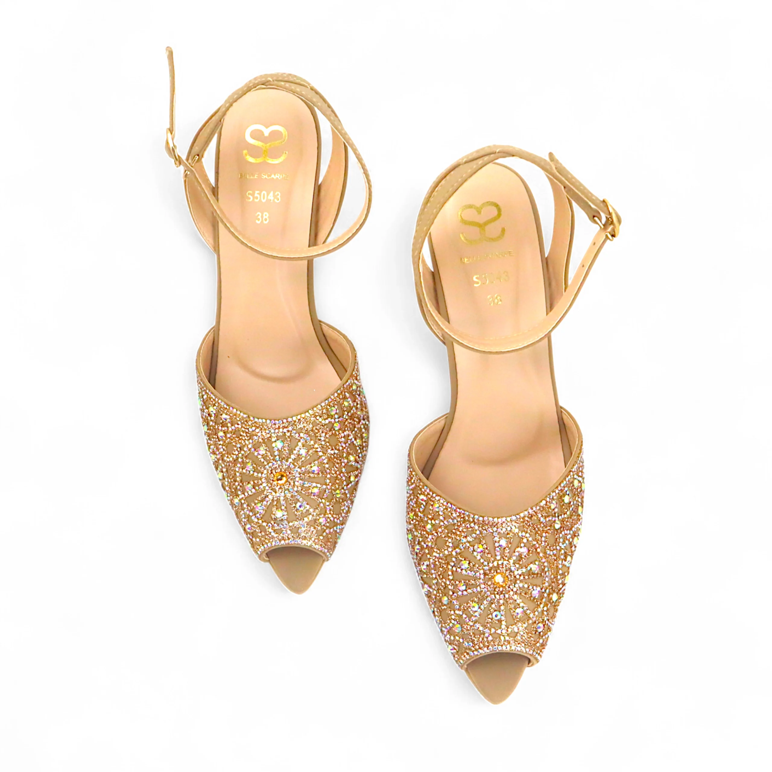 Introducing the Golden Bloom, a radiant 3-inch heel crafted for celebrations and timeless elegance. Designed in a soft gold tone, this heel features an intricately embellished upper with floral beadwork and shimmering stones that sparkle beautifully with every step. The peep-toe front adds a graceful touch, while the wrap-around ankle strap ensures a secure and comfortable fit.