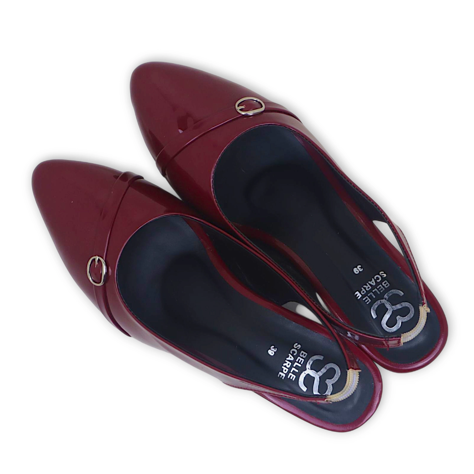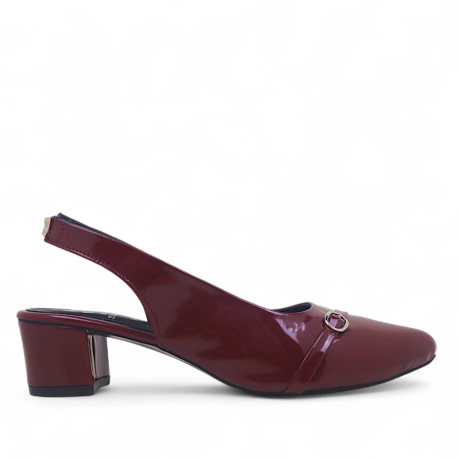 Introducing the Merlot Muse, a refined 2-inch slingback heel that combines contemporary poise with timeless charm. Designed in a rich burgundy tone with a glossy finish, this heel features a sleek closed-toe silhouette accented by a delicate strap and metallic buckle detail — adding just the right touch of sophistication.