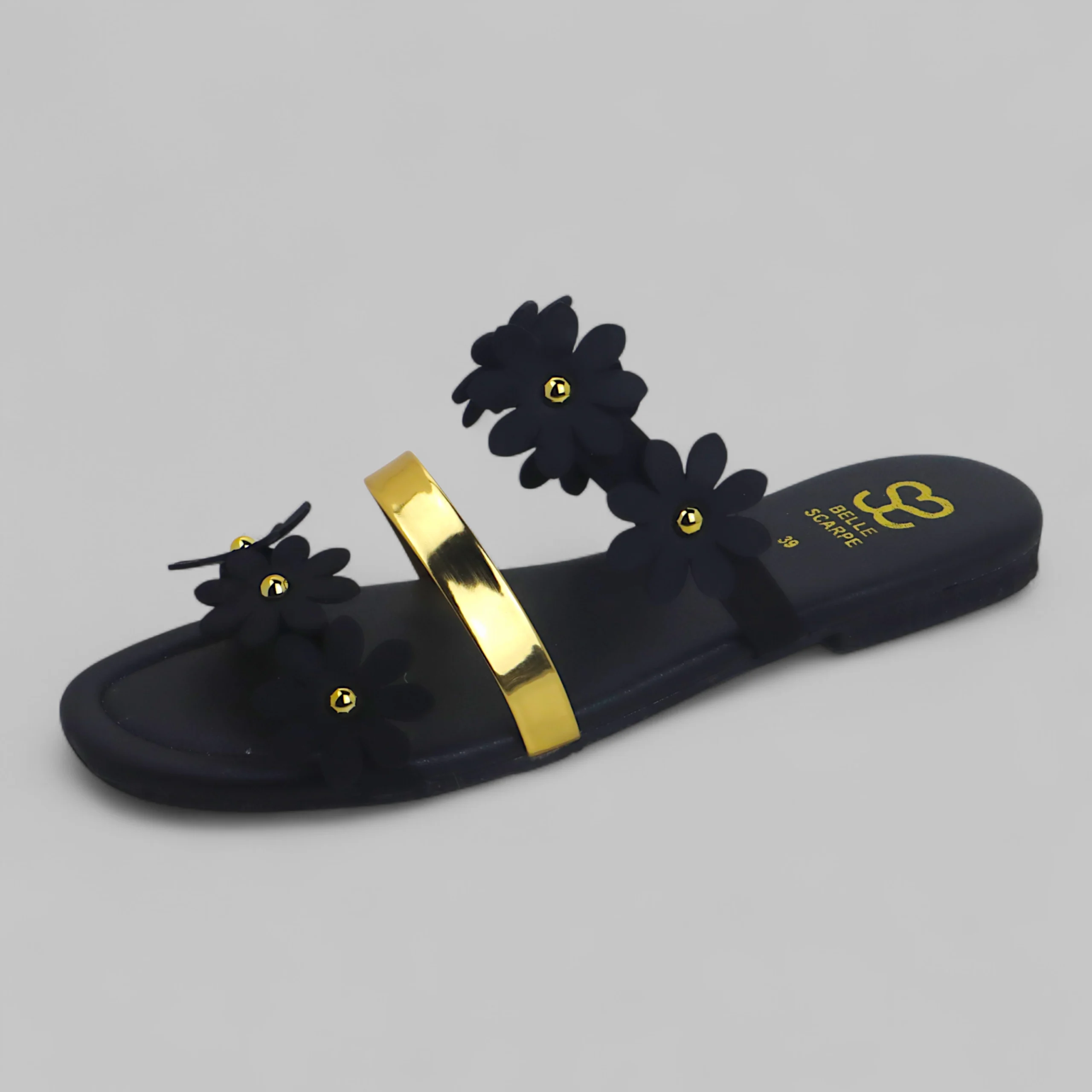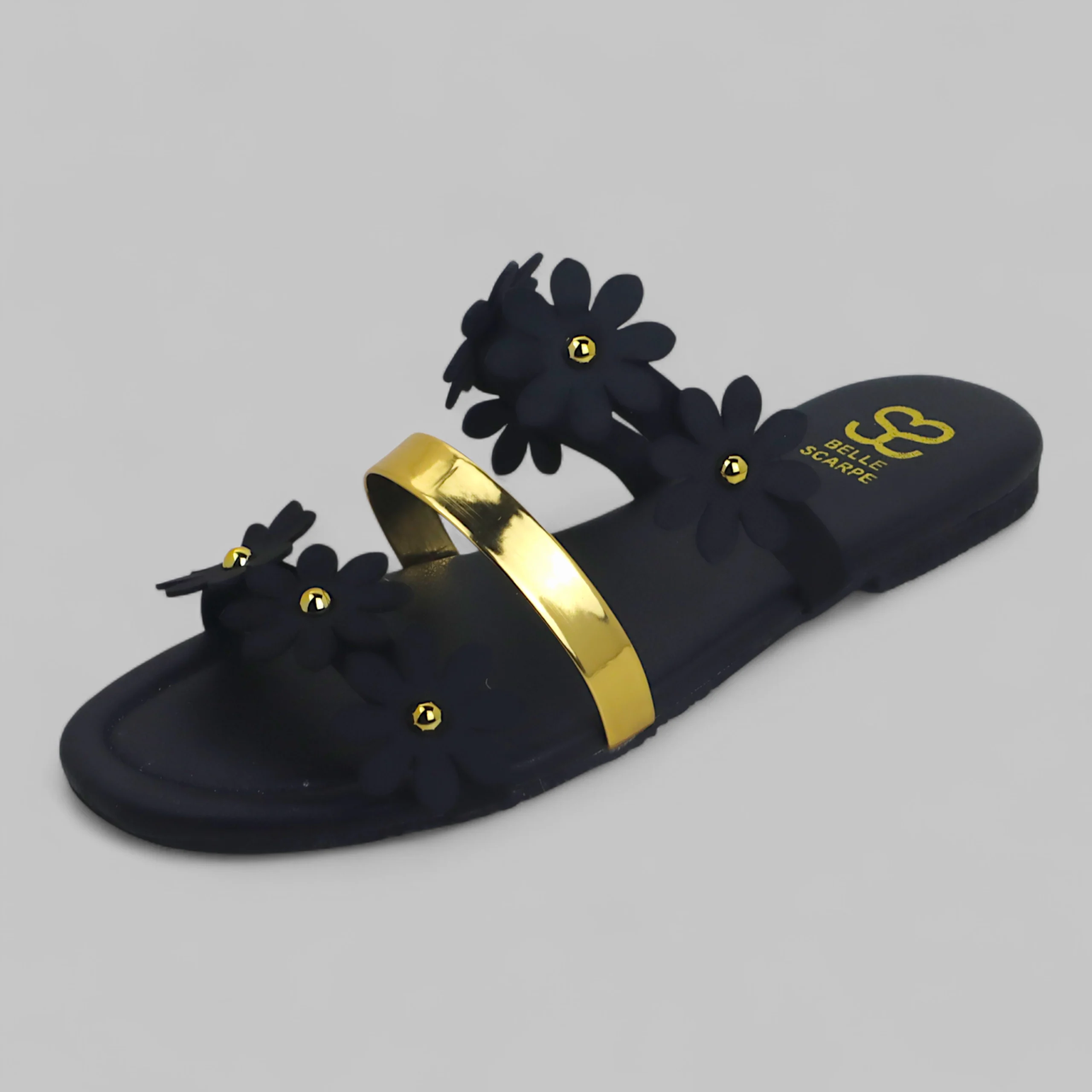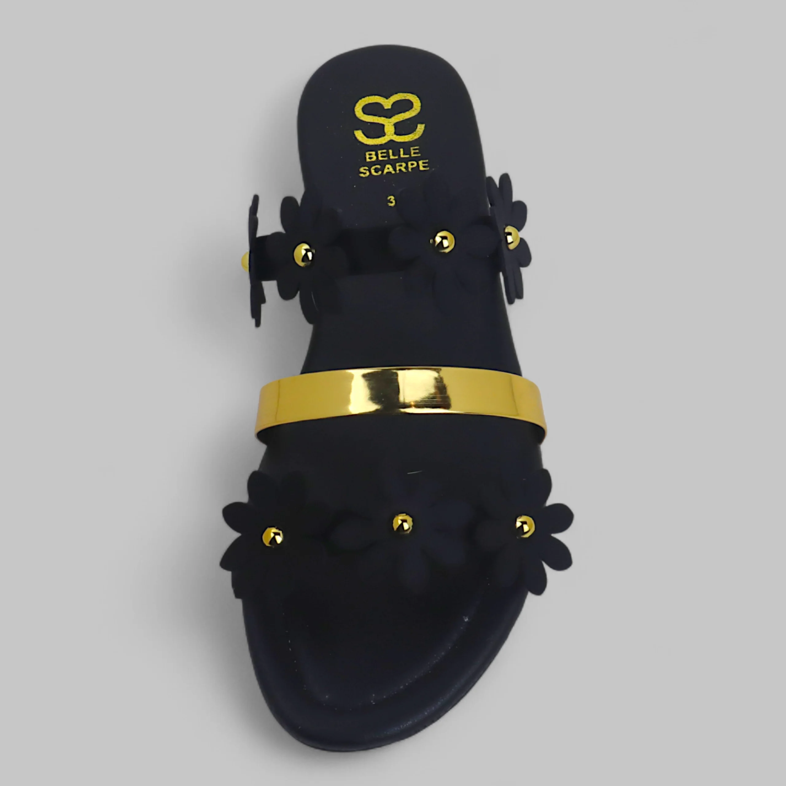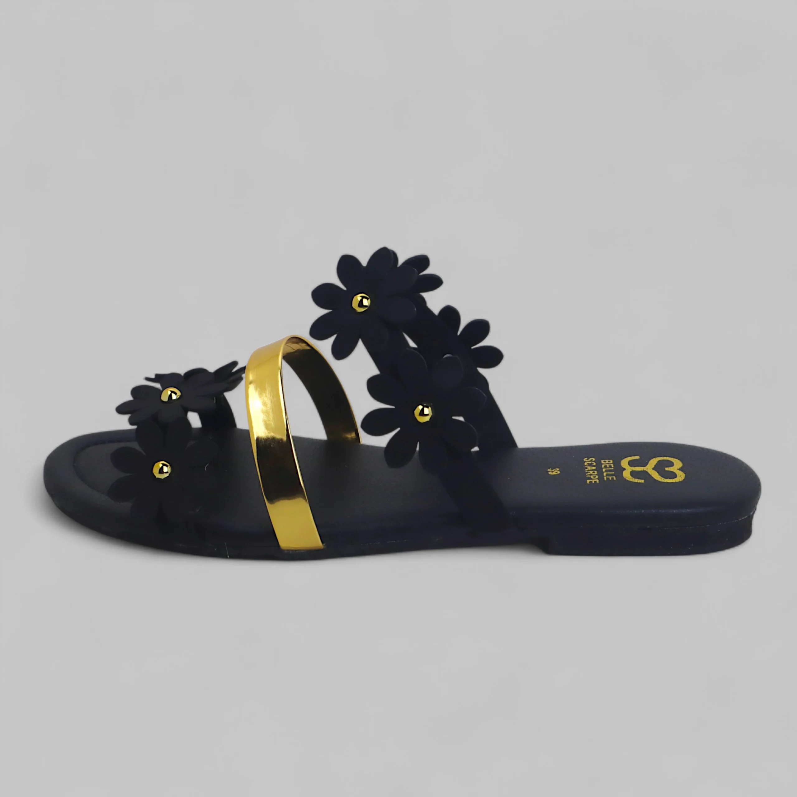 Introducing the Midnight Bloom Flat, a statement flat that blends elegance with artistic detail. Crafted in classic black, this flat features a unique strap design with one sleek golden strap paired with two black straps, topped with delicate black floral accents that add texture and charm. Comfortable and eye-catching, it’s perfect for elevating everyday looks or adding a subtle statement to festive outfits.