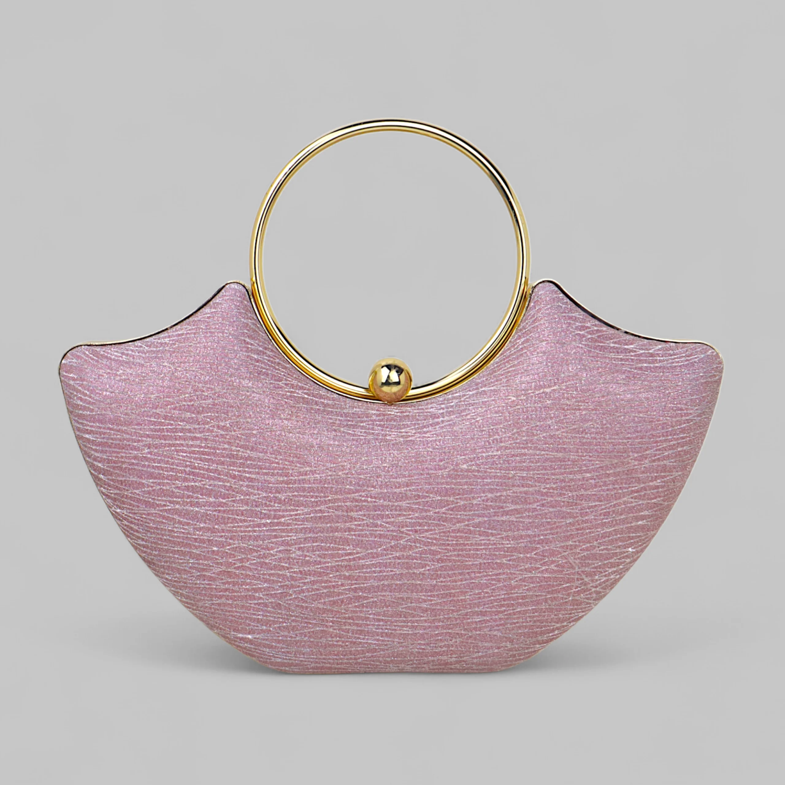 A chic crescent-shaped clutch with a statement metal ring handle, designed for elegant evenings and modern styling.