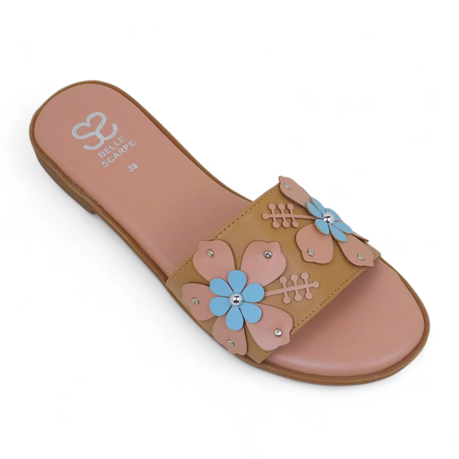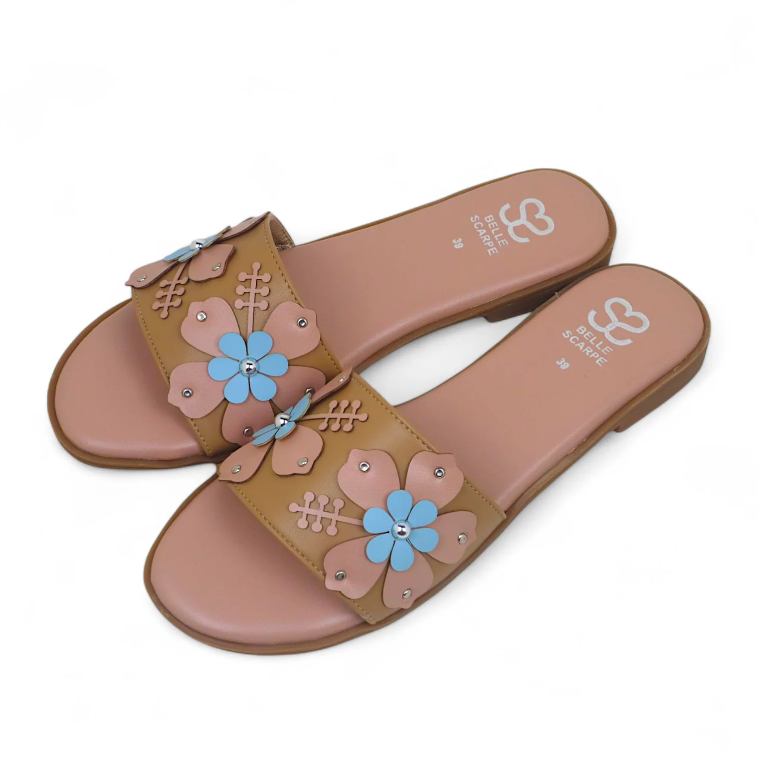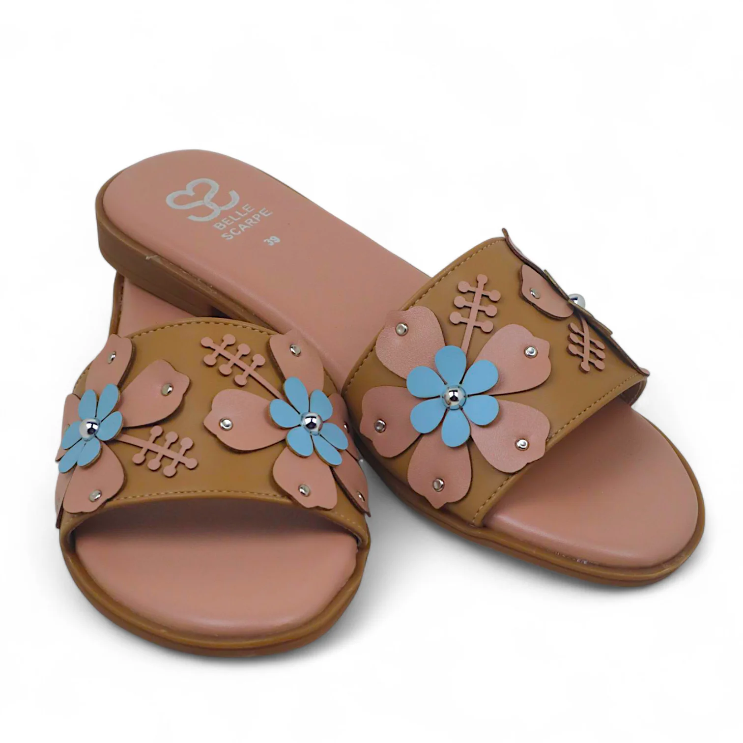 Introducing the Petal Whisper, a graceful flat that combines soft hues with delicate craftsmanship. Designed with a tea-pink sole and adorned with handcrafted leather flowers in lighter shades, this piece brings a romantic, feminine touch to everyday wear.