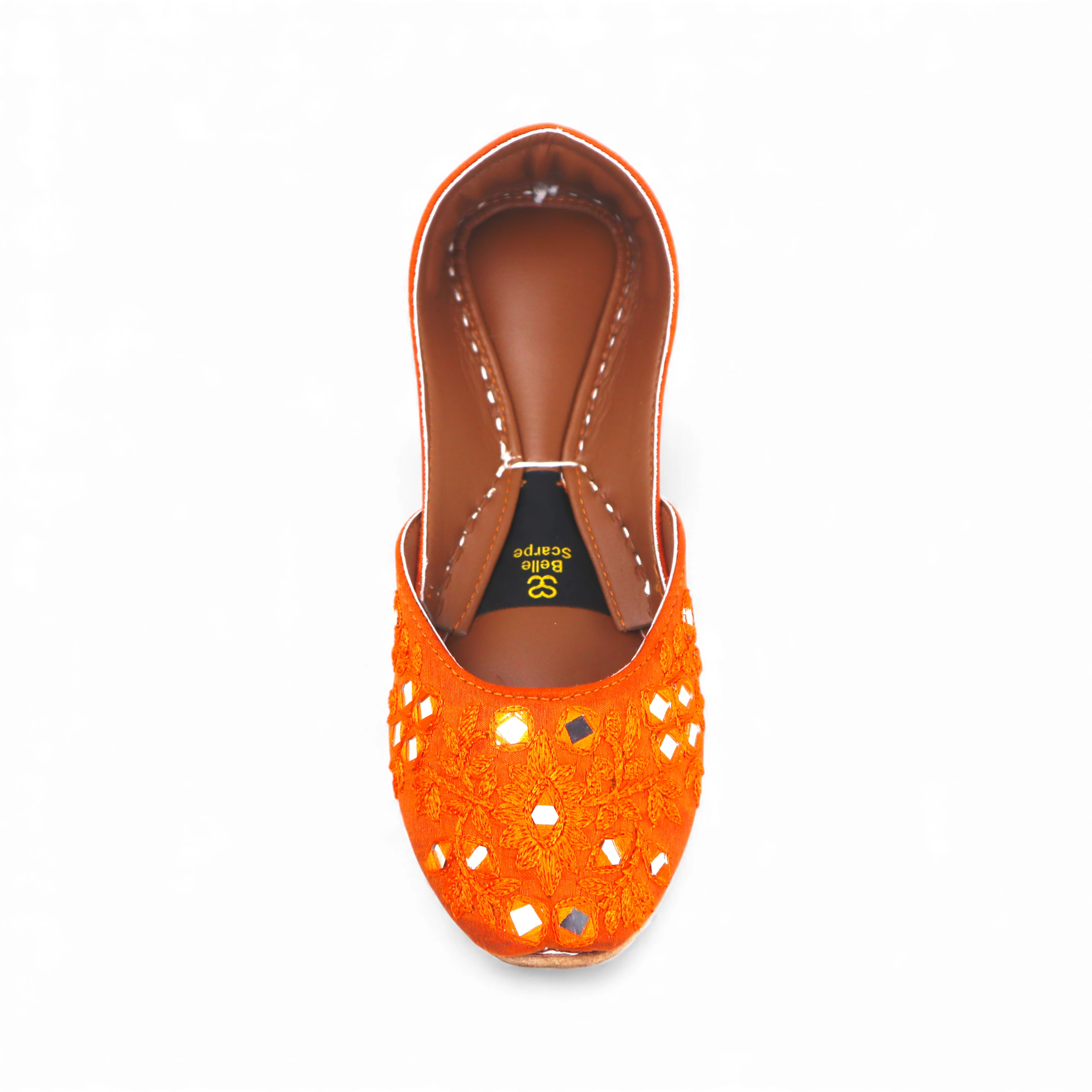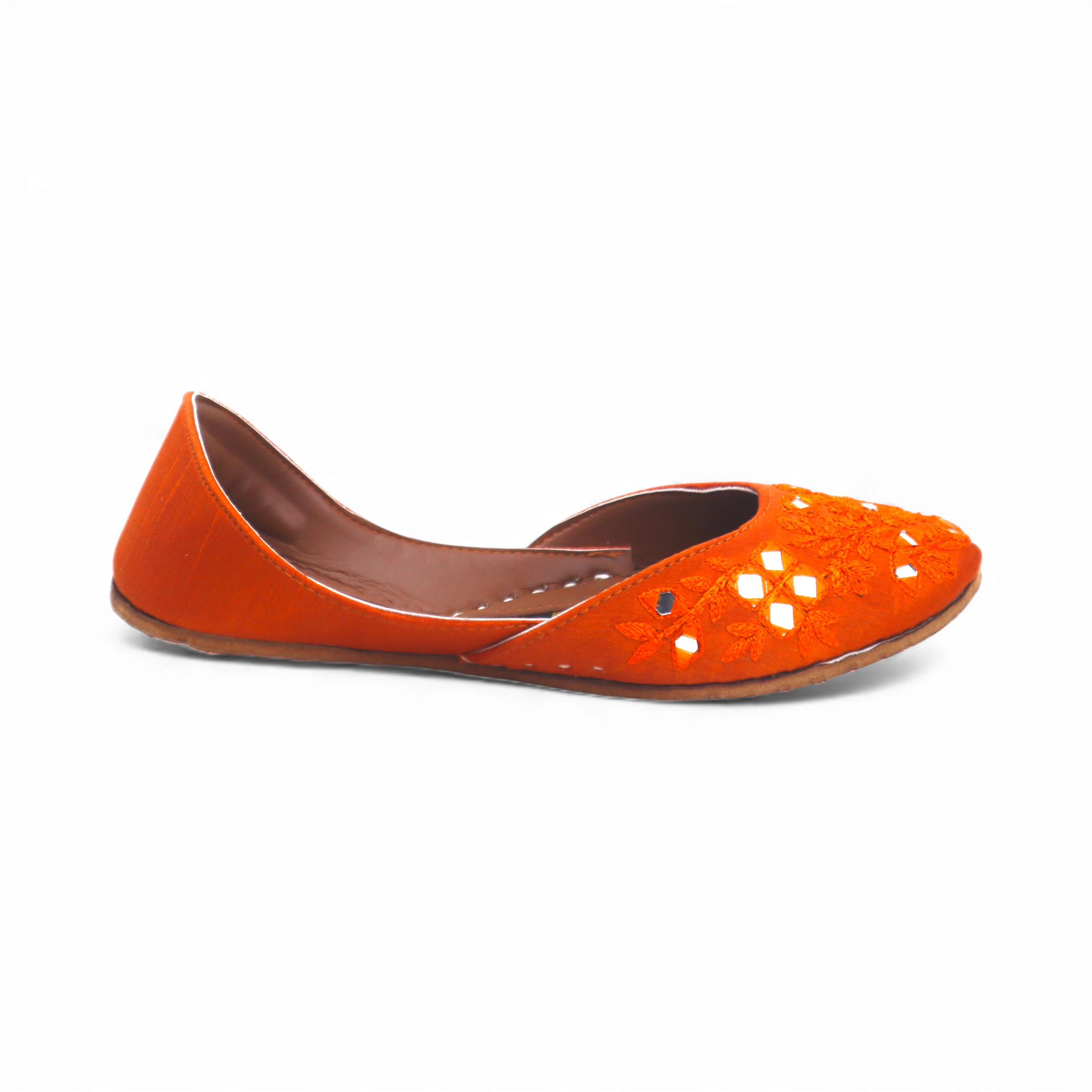 Introducing the Sunset Charm Khussa, a flat slip-on that radiates vibrant elegance. Crafted with a crisp white base and adorned with intricate orange hand-embroidered patterns, this Khussa brings a lively yet sophisticated touch to any outfit. Lightweight and comfortable, it’s perfect for casual wear or festive occasions, blending traditional craftsmanship with a pop of modern color.