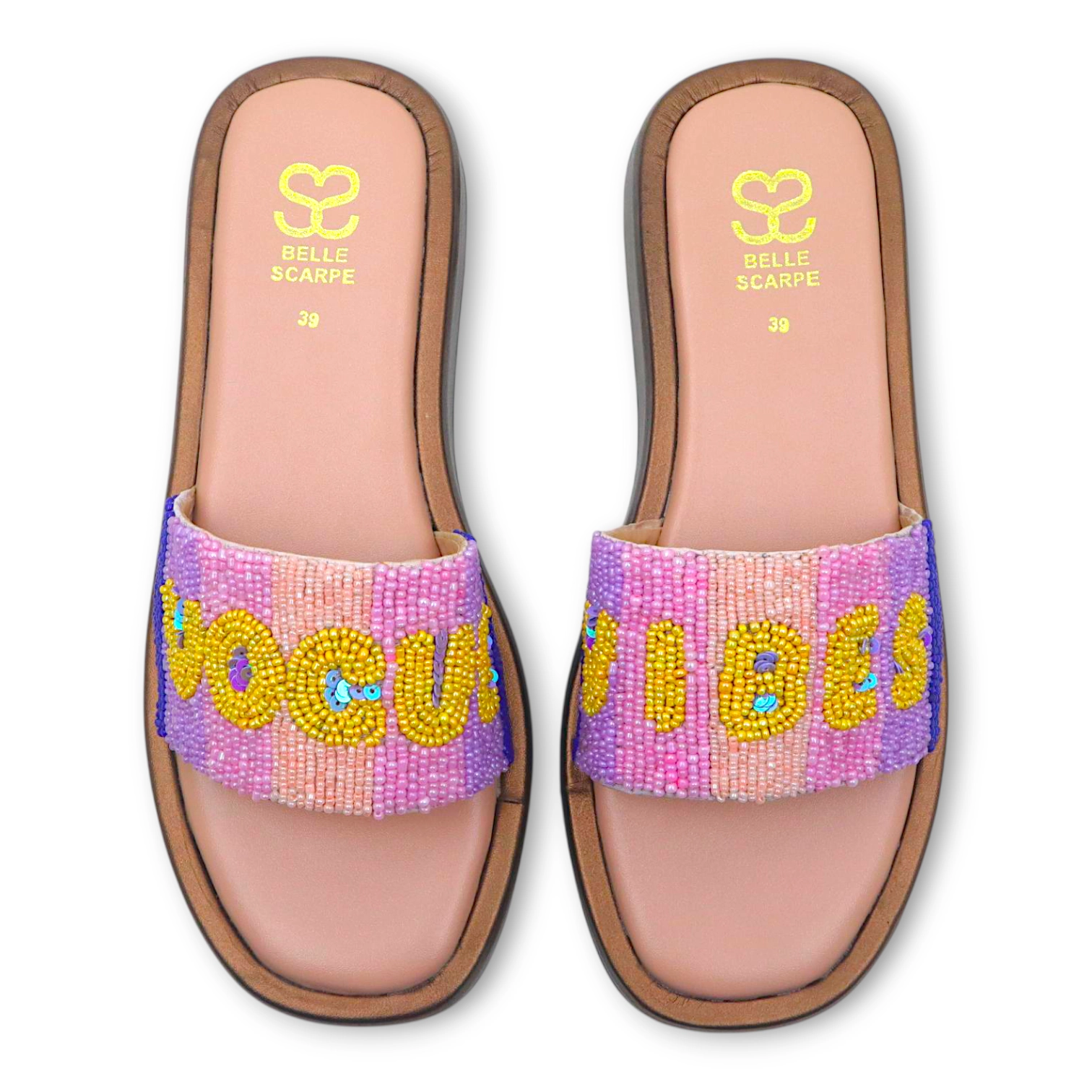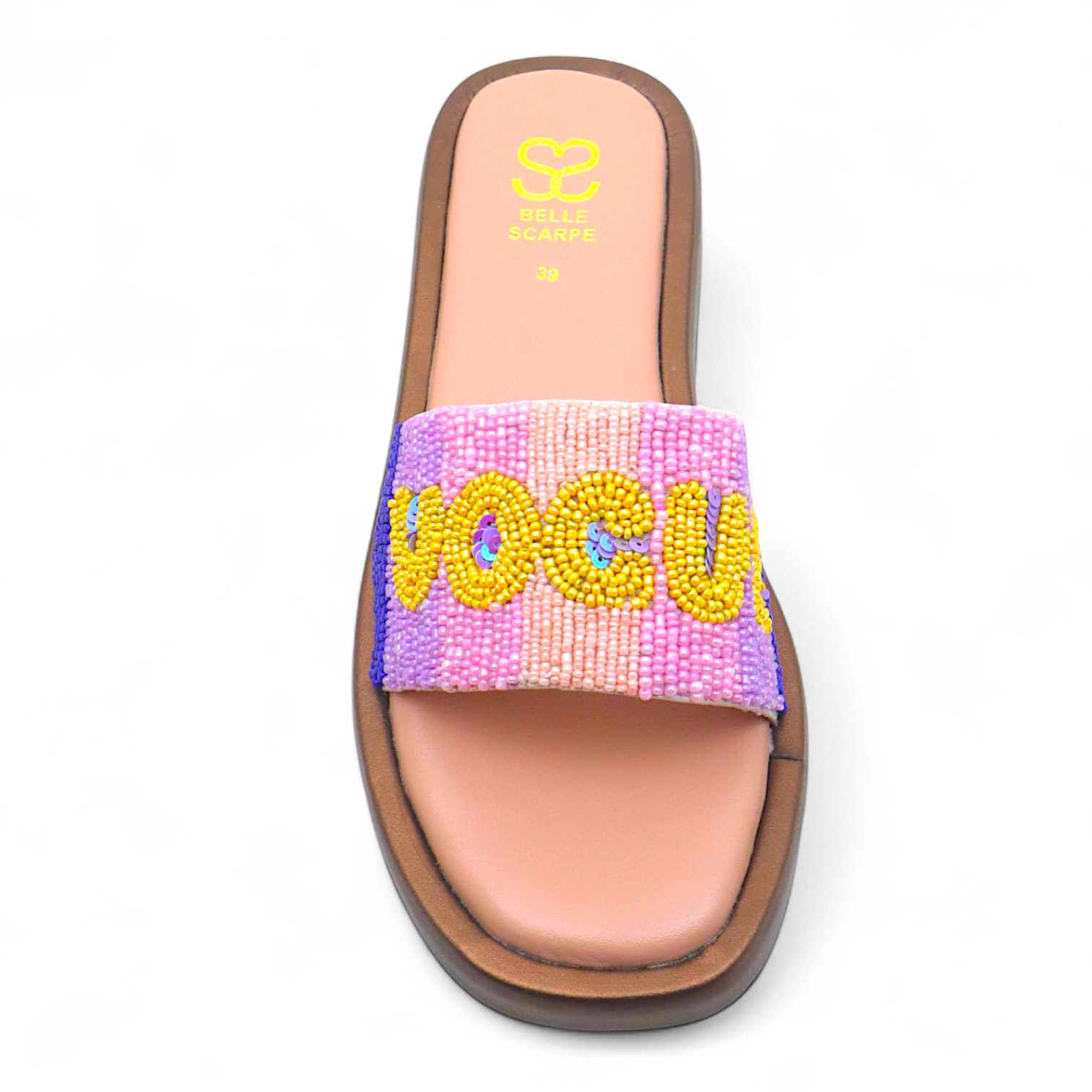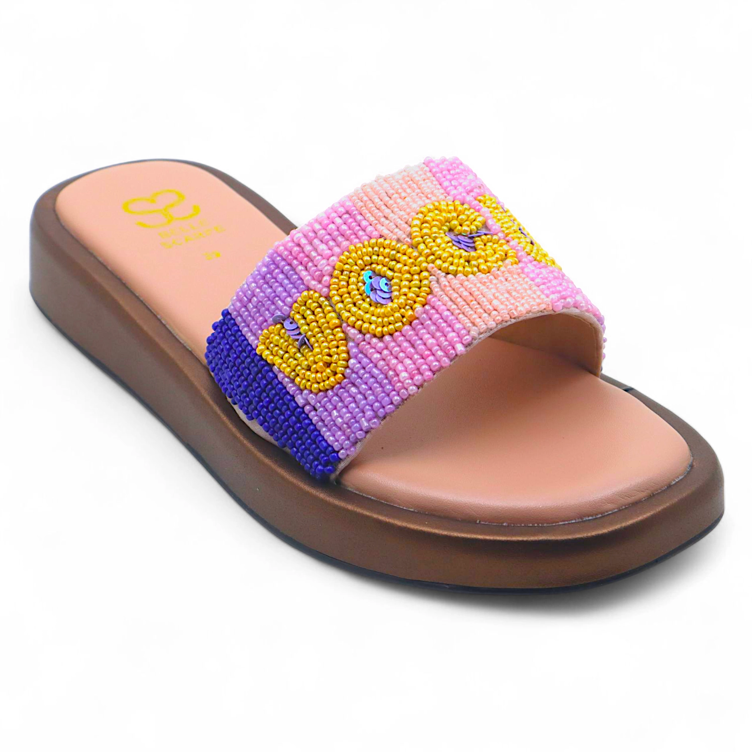 Introducing the Vogue Bead Slider, a vibrant handcrafted piece that blends playful color with modern comfort. Featuring a hand-beaded strap in soft shades of pink, purple, and peach, it proudly displays the word “Vogue” in golden beads for a bold, fashion-forward touch. Set on a comfortable brown sole with a soft peachy-pink footbed, this handcrafted slider offers both ease and personality — perfect for days when you want to stand out effortlessly. Best served with • Casual Chic: Pairs perfectly with jeans, shorts, or summer dresses. • Everyday Wear: Ideal for lounging, errands, or coffee runs in style. • Playful Looks: Complements colorful outfits or adds a pop to minimalist ensembles.