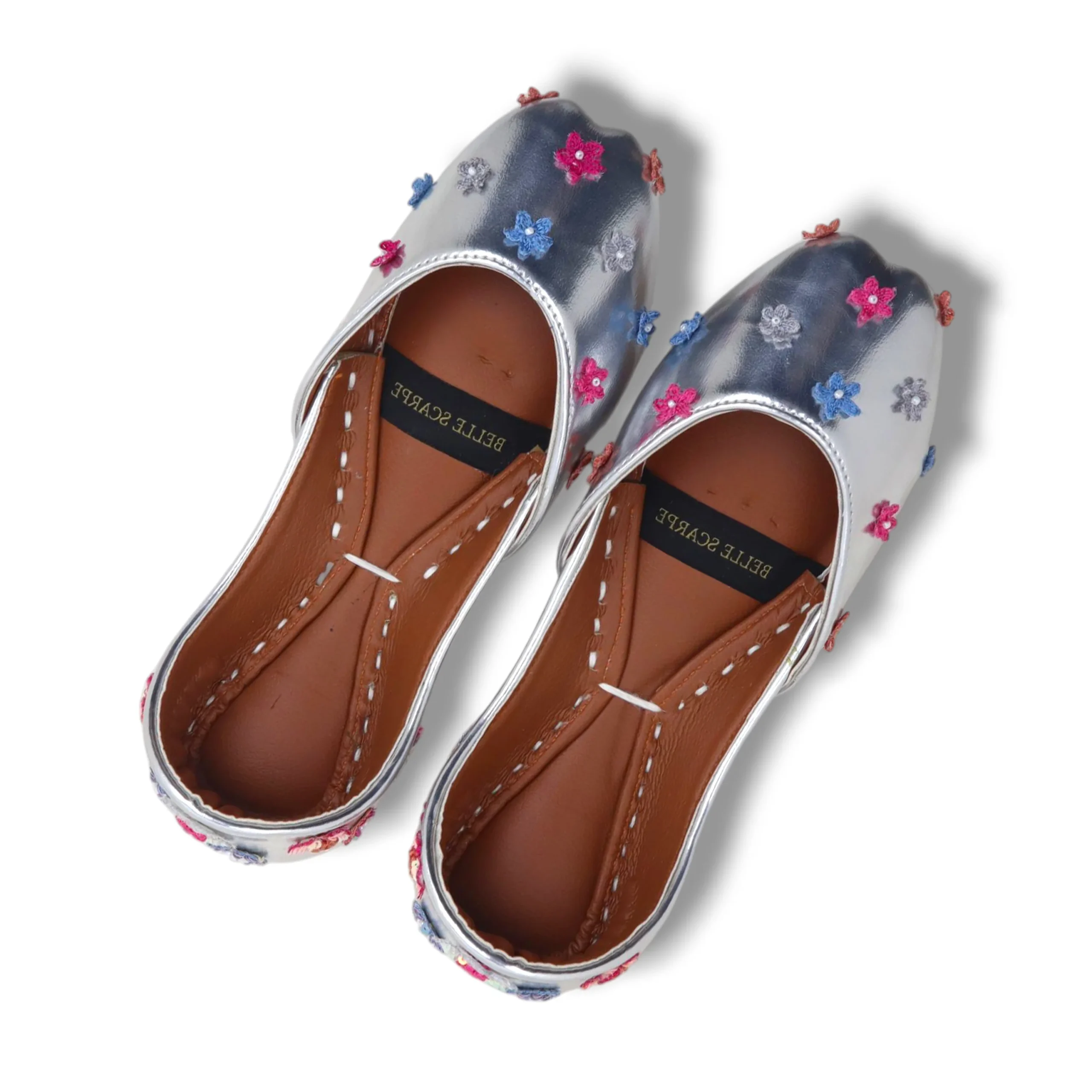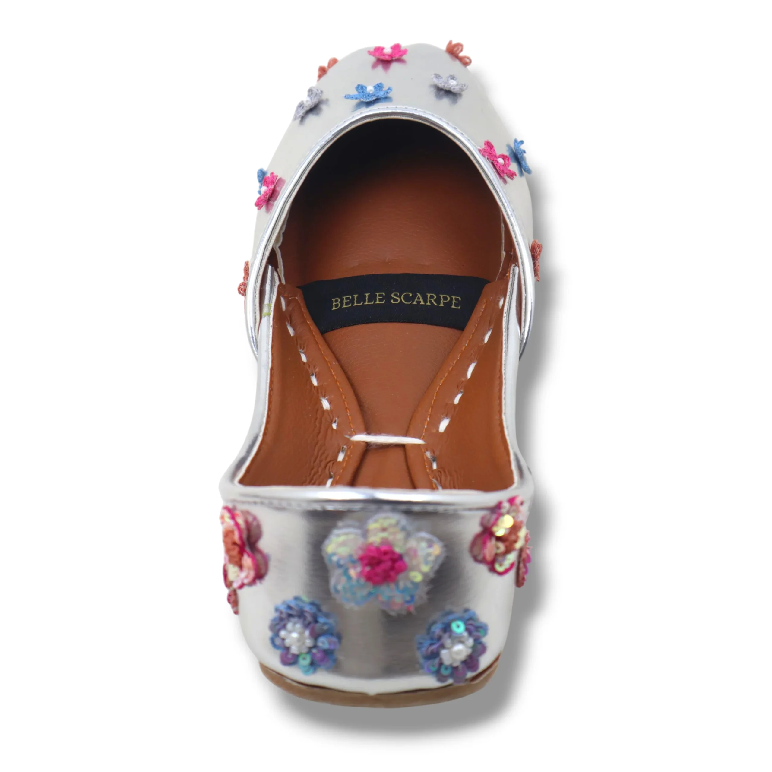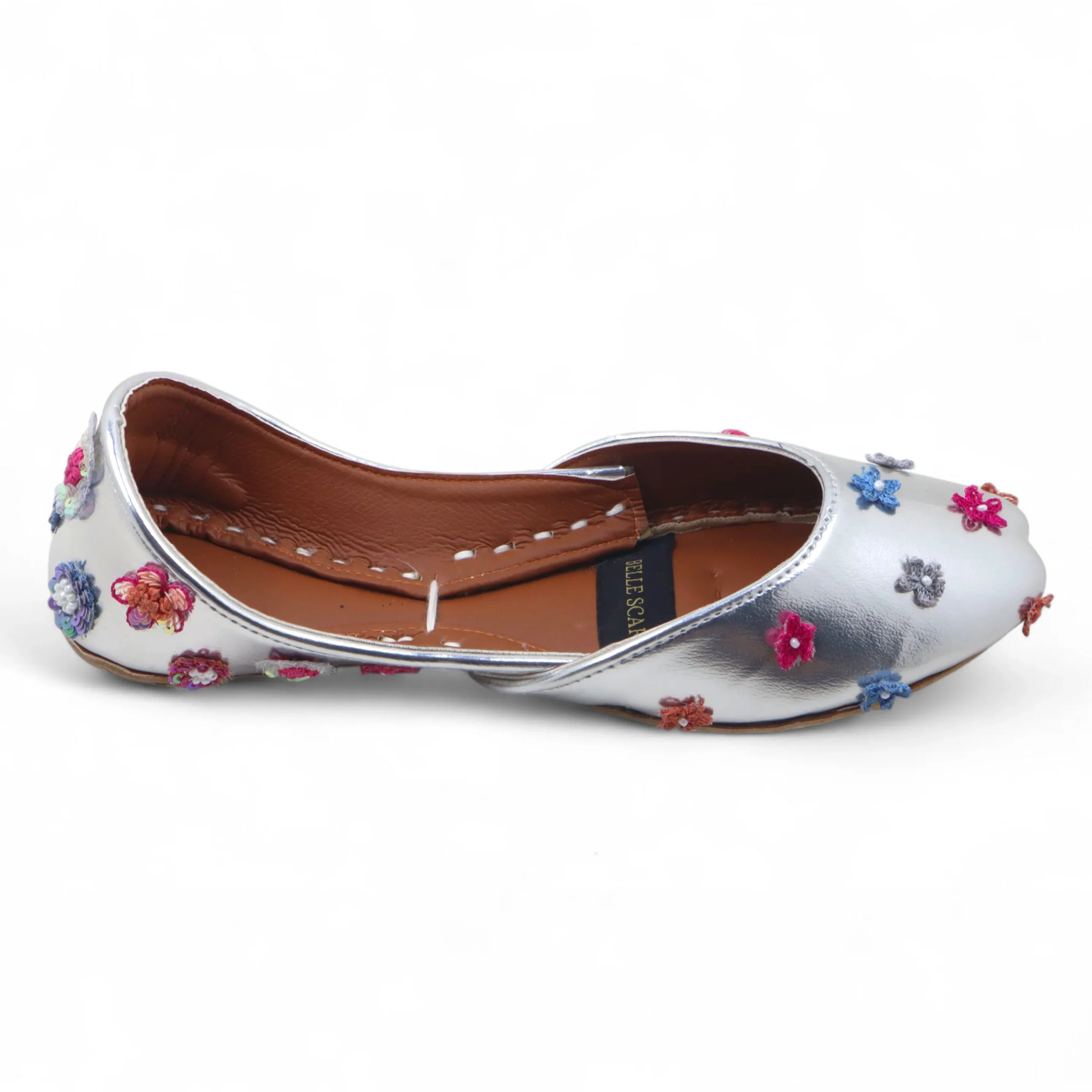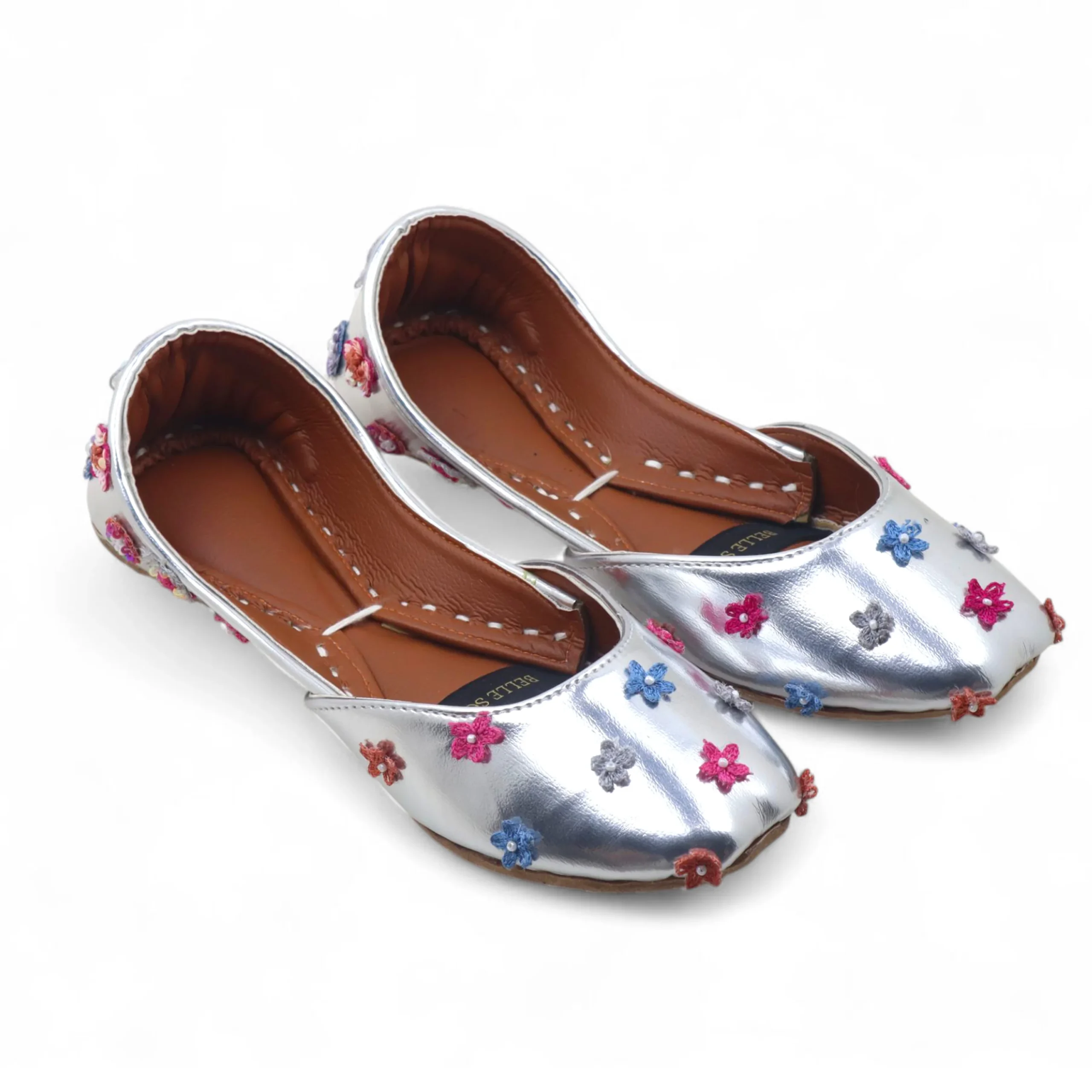 Introducing the Winter Joy, a whimsical silver kussa that beautifully blends tradition with playful charm. The sleek metallic silver base is hand-adorned with delicate multicolored floral embroidery, creating a vibrant tapestry of colors that stand out against the shimmering backdrop.